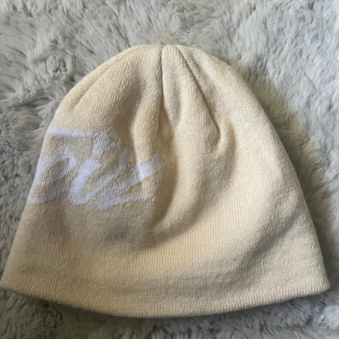 Snygg beige mössa från Corteiz med vit, stor logotyp i skriven stil över hela mössan.