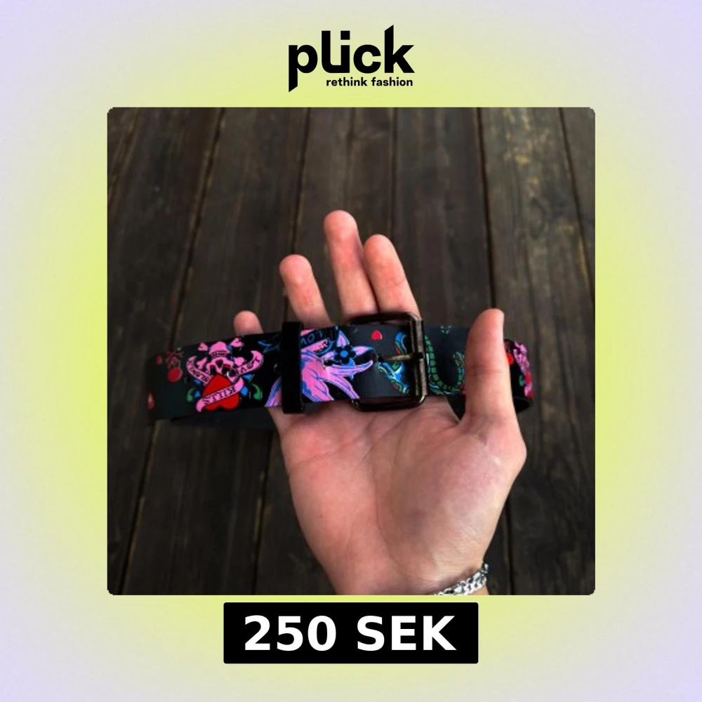 Coolt svart ed hardy bälte . Perfekt för att ge en edgy touch till din outfit. Passar bra till mig som bär 32 i midja. Lite slitigt