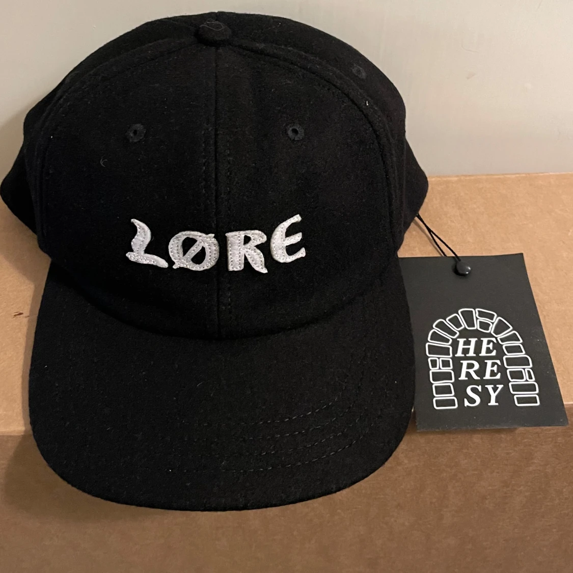 Snygg svart keps från Heresy med vit broderad text 'LØRE' på framsidan. Oanvänd med tags.