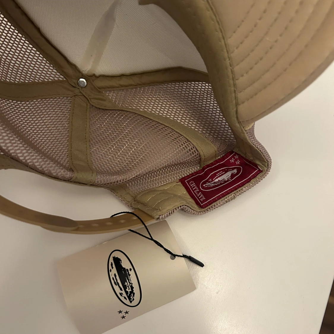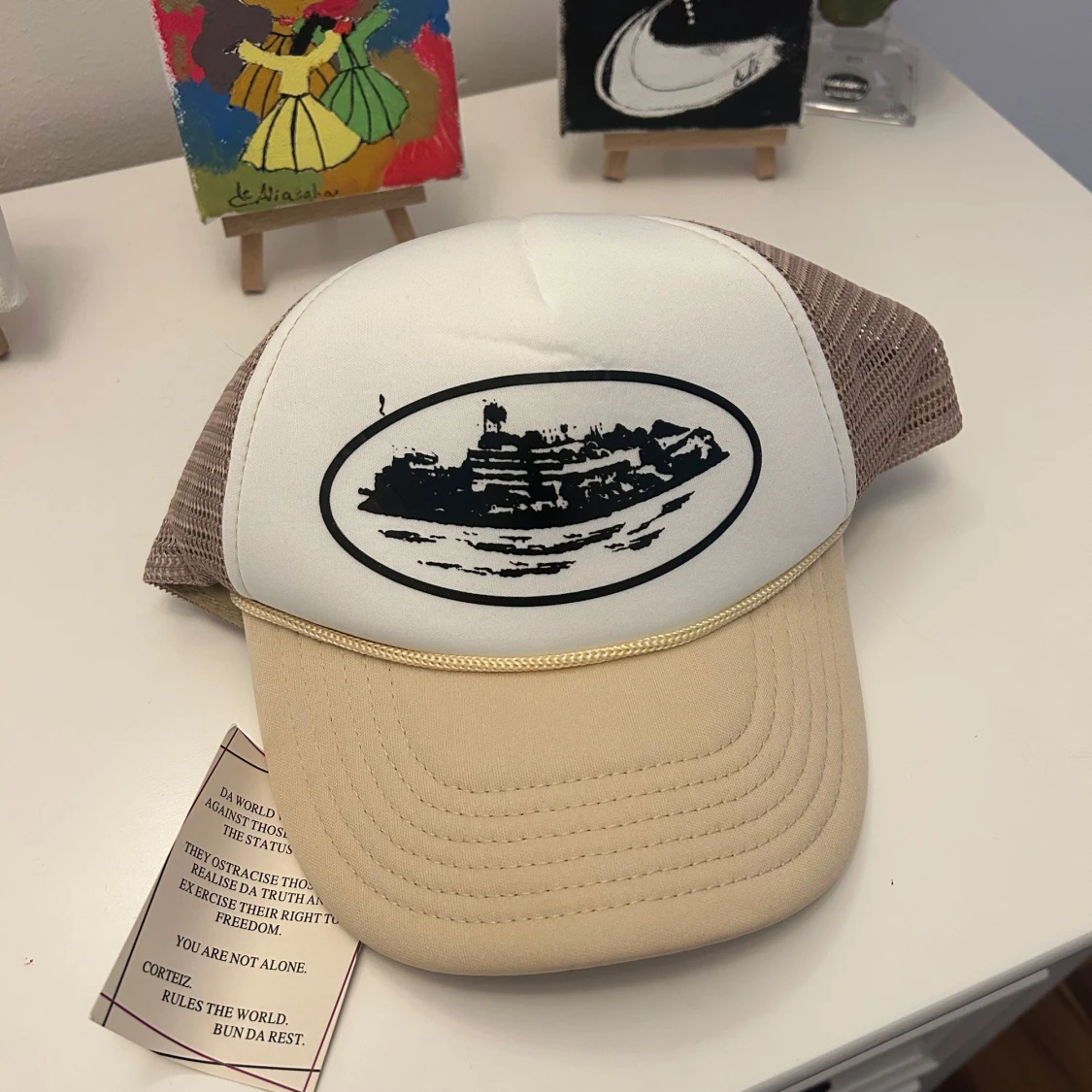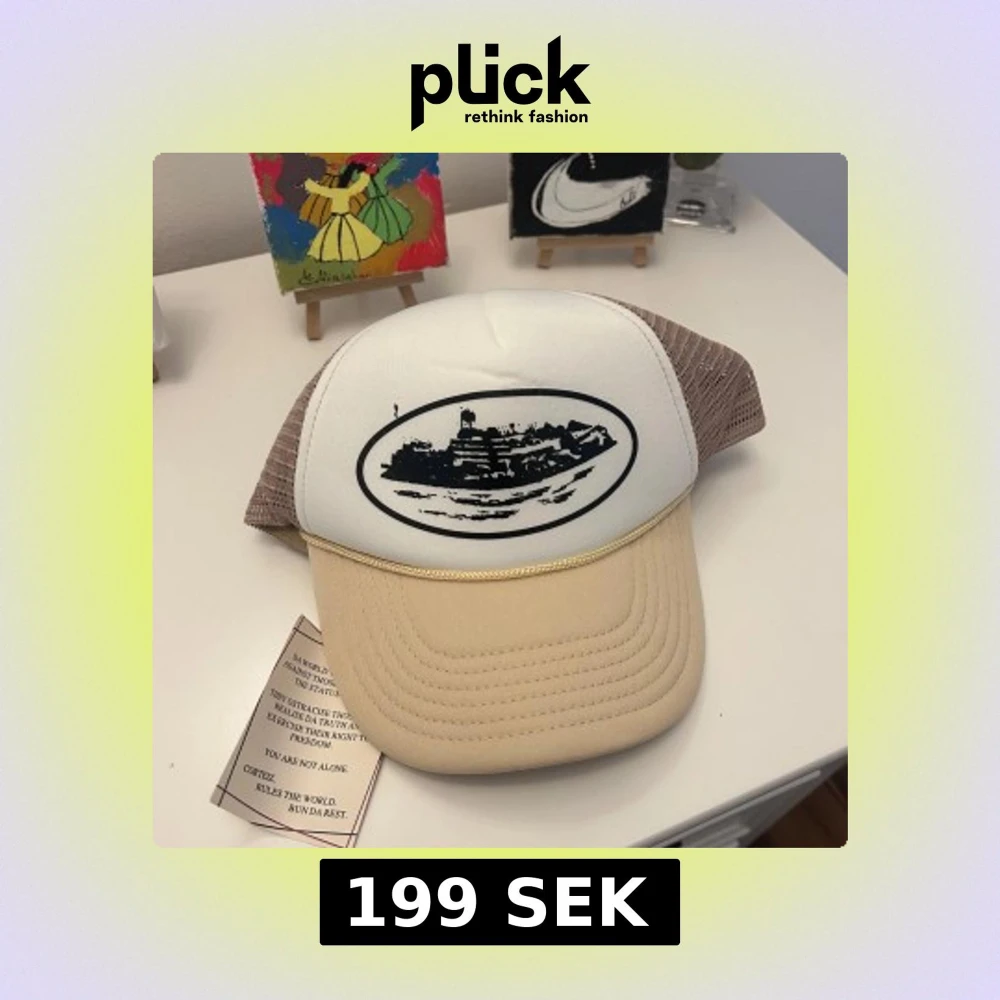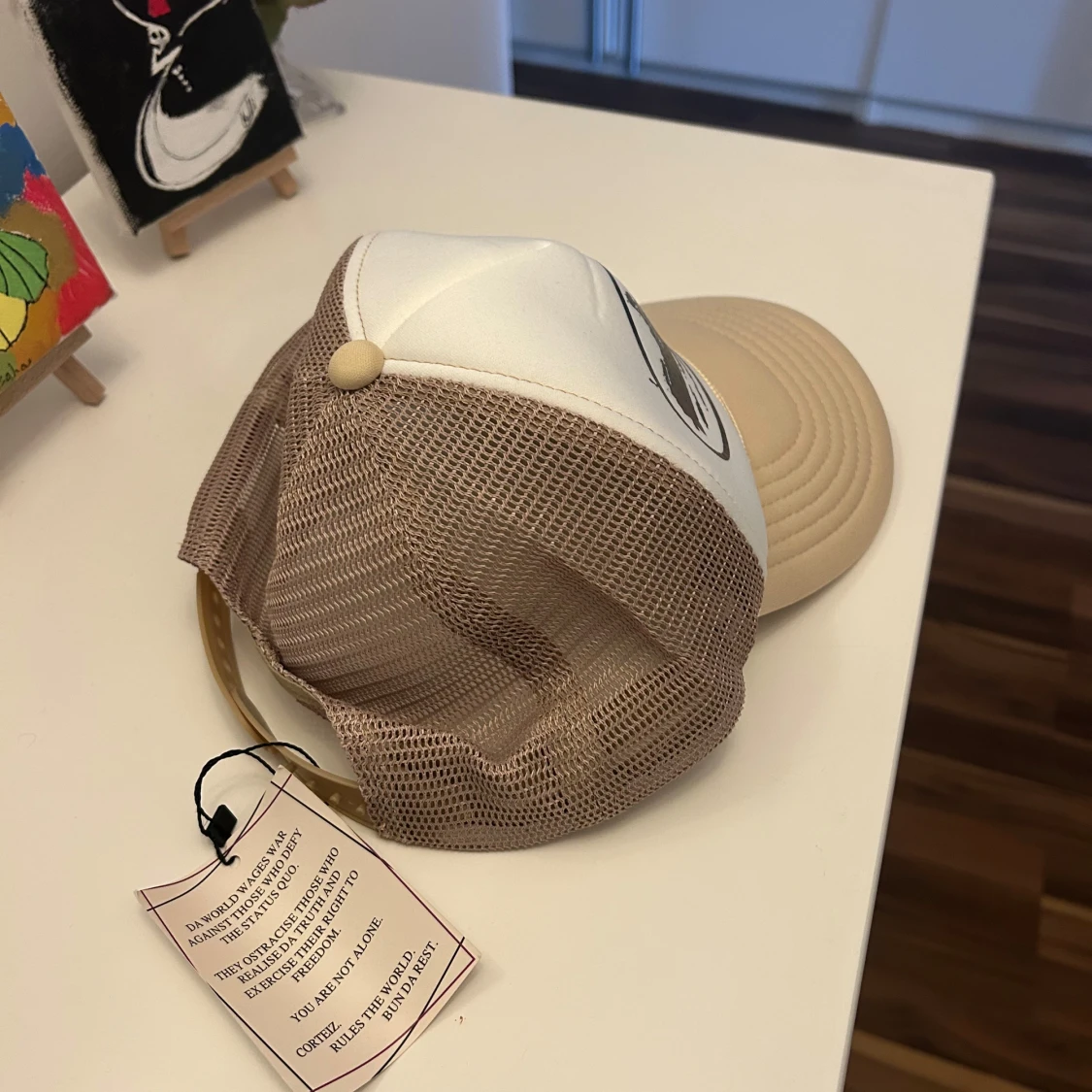 Snygg truckerkeps från Corteiz i beige och vitt med mesh på sidorna och bak. Framsidan har ett svart tryck av en stad i oval ram. Justerbar snapback och coolt broderat märke på insidan. Perfekt för en chill och trendig look.