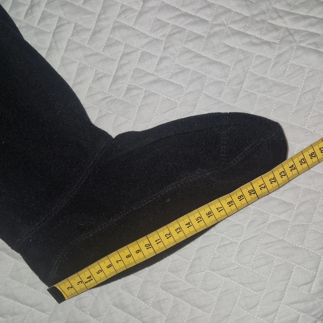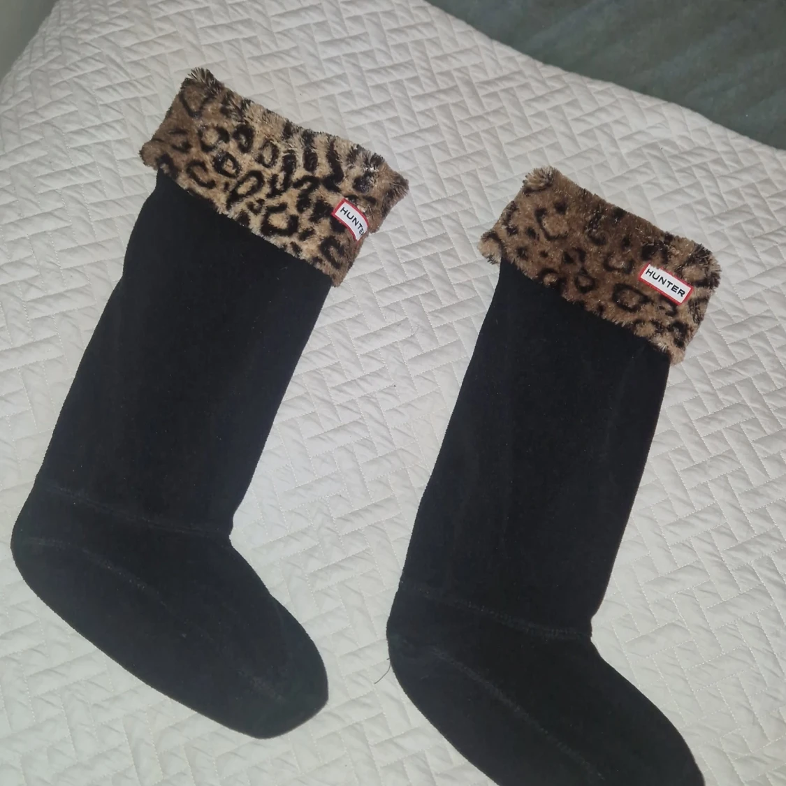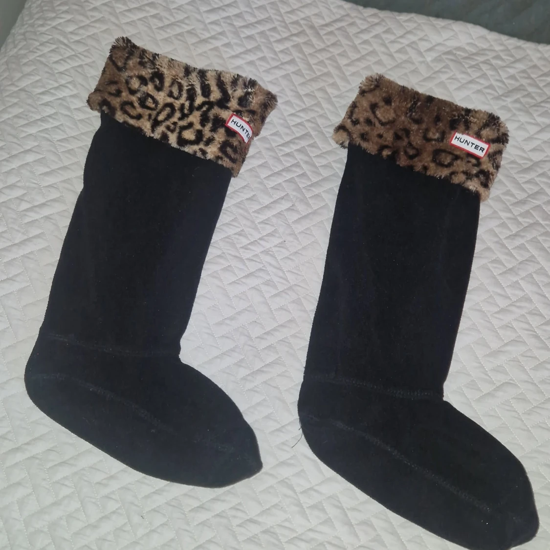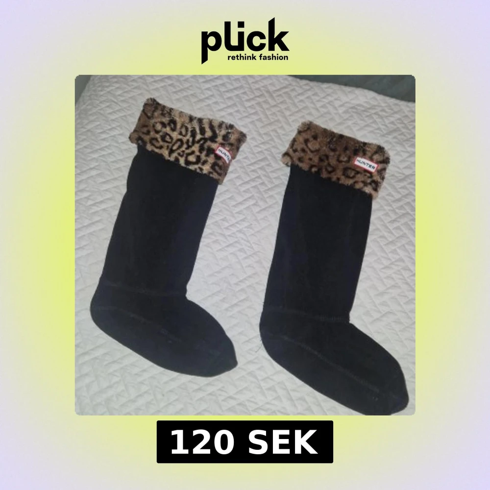 Knappt använda Hunter-stövelstrumpor som är specifikt utformade för att användas med Hunters gummistövlar, särskilt de höga modellerna. De är tillverkade av mjuk fleece med en dekorativ fuskpäls-manschett med leopardmönster. Manschetten viks över kanten på stöveln för att visa Hunter-logotypen. Ger extra värme och bekvämlighet samt så är det fint.