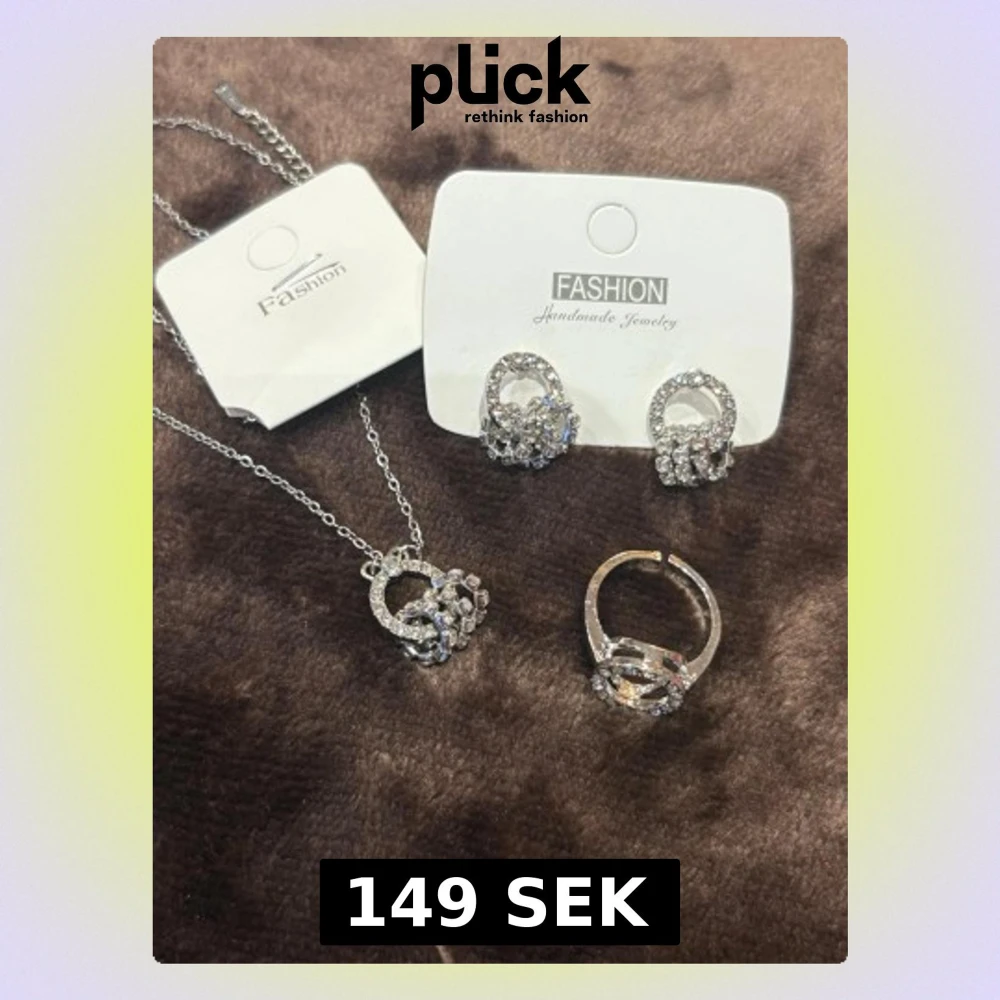 ett smyckeset med halsband, örhĂ€ngen och ring i silverfĂ€rg med glittrande stenar đ©¶