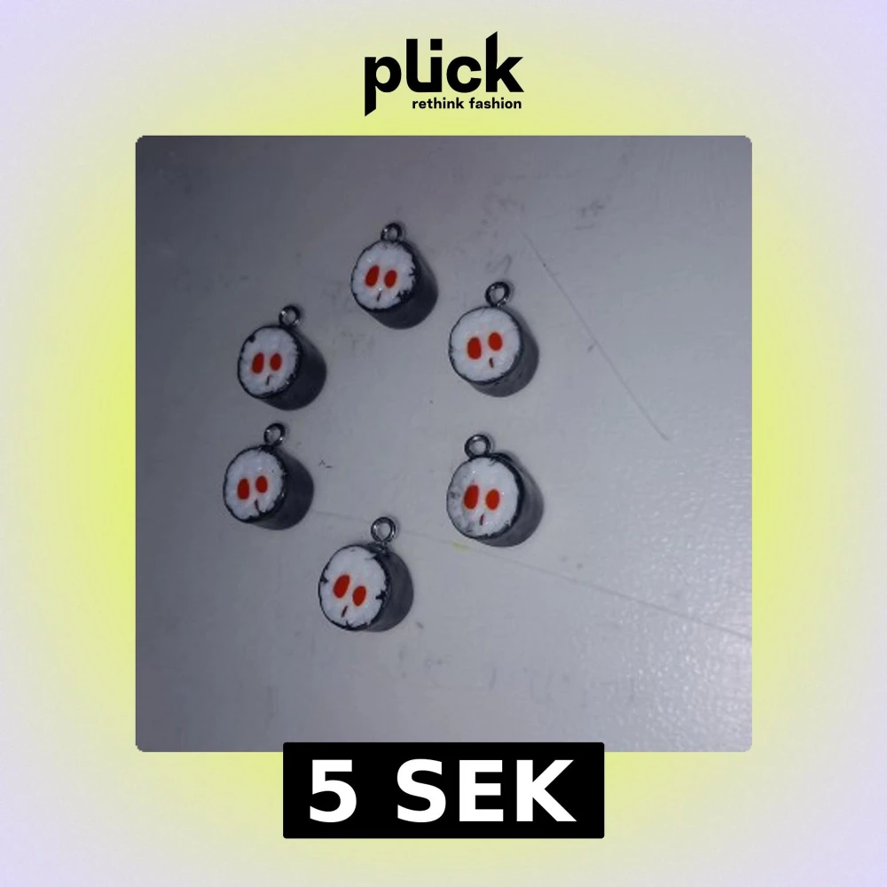 Sex stycken handgjorda berlocker som ser ut som små sushibitar med svart, vitt och rött. Perfekta att använda som hängen till halsband eller armband för en unik och lekfull stil.