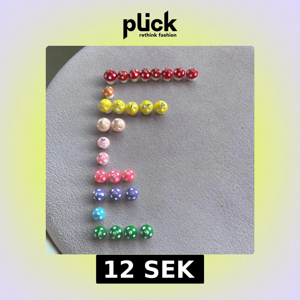 Säljer ett gäng söta svampberlocker i olika färger som röd, gul, grön, blå, lila, rosa, orange och beige. Perfekta att använda till halsband, armband eller örhängen. Alla berlocker har vita prickar och metallögla för enkel montering. Skapa dina egna unika smycken!