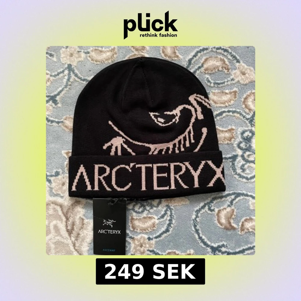 Snygg svart mössa från Arc'teryx med stor beige logga och fossilmotiv på framsidan. Mössan är stickad och har uppvikt kant med Arc'teryx-text. Perfekt för dig som gillar outdoor och vill ha en clean look med cool branding.