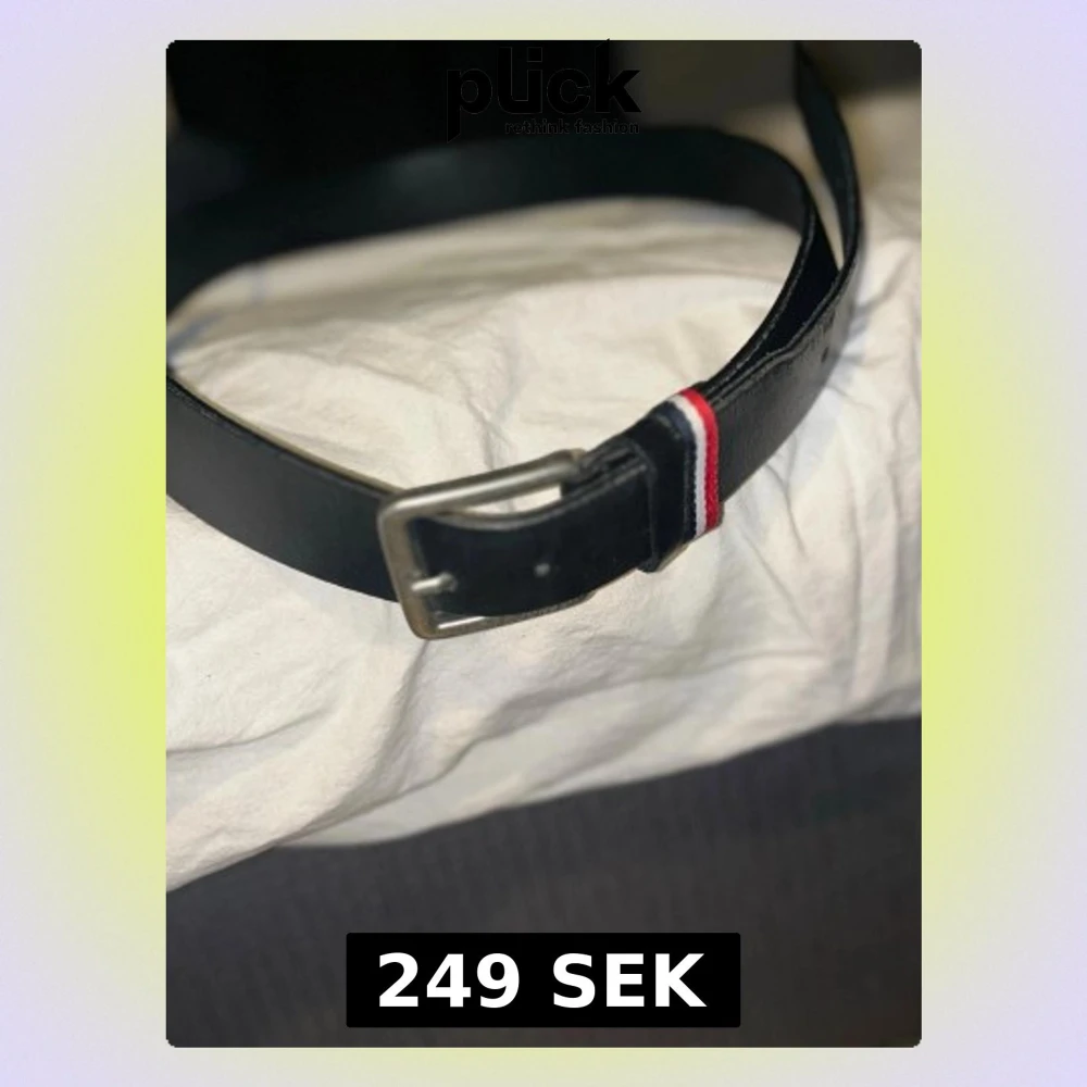Snyggt svart bälte från Jack & Jones med metallspänne och en cool detalj i form av en röd, vit och blå rand vid spännet. Bältet är tillverkat i skinn och har en stilren, klassisk form som passar till jeans och chinos. Väldigt bra skick, och inte använd så mycket. Köpt för 289 kr. Pris kan diskuteras!