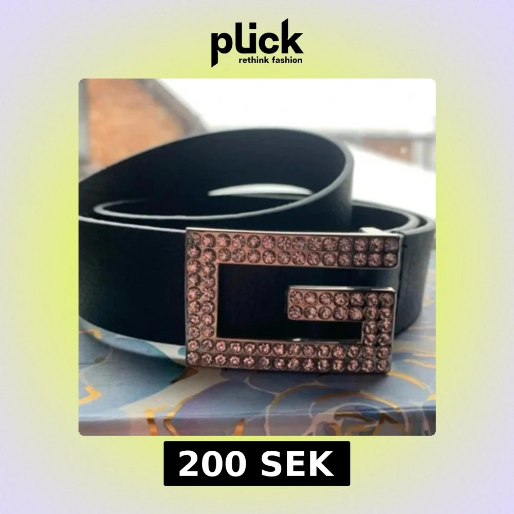 Snyggt svart bälte från Guess med ett stort, fyrkantigt spänne dekorerat med glittrande stenar. Bältet är gjort i skinn och har flera hål för justering. Perfekt accessoar för att lyfta din outfit med lite extra bling.