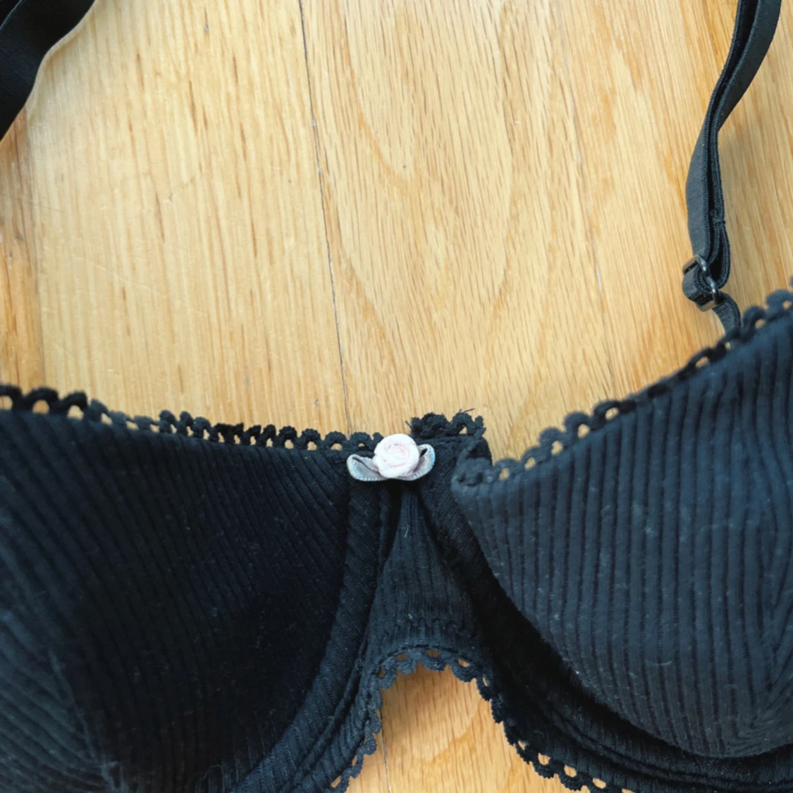 Svart bh med ribbad struktur och söt spetskant längs kuporna. Dekorerad med en liten ljusrosa ros i mitten framtill. Vet tyvärr inte strl men skulle gissa på 75 A/B💕