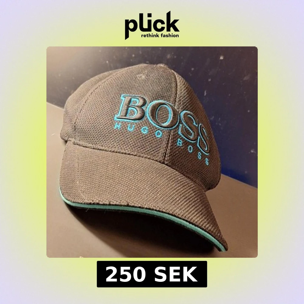Snygg svart keps från Hugo Boss med turkos broderad logotyp framtill. Kepsen har en justerbar rem baktill med metallspänne och turkosa detaljer. Perfekt för en stilren look. Kepsen är I övrigt I mycket bra skick. Endast använd ett fåtal gånger.