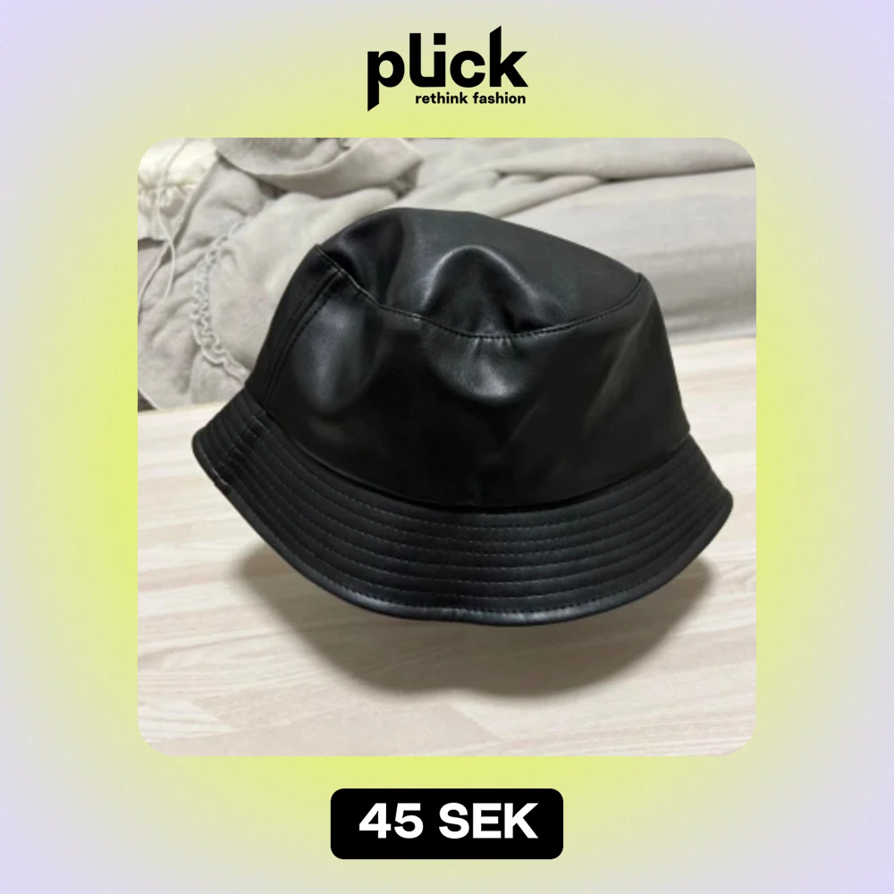 Säljer en snygg och trendig svart bucket hat i skinn. Perfekt för att ge din outfit en cool touch. Hatten har en normal passform och är tillverkad i ett mjukt och bekvämt material. Passar både till vardags och fest!