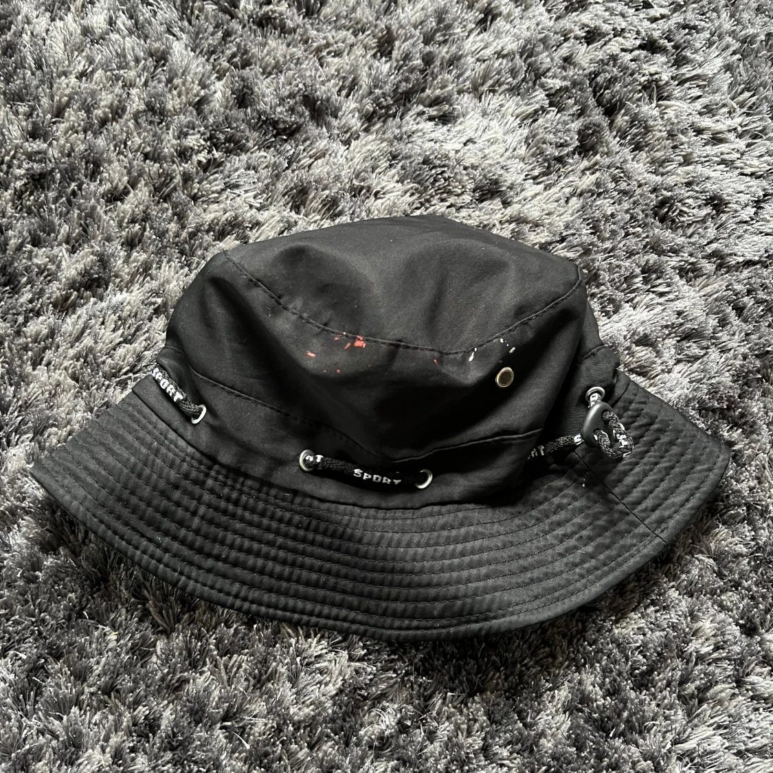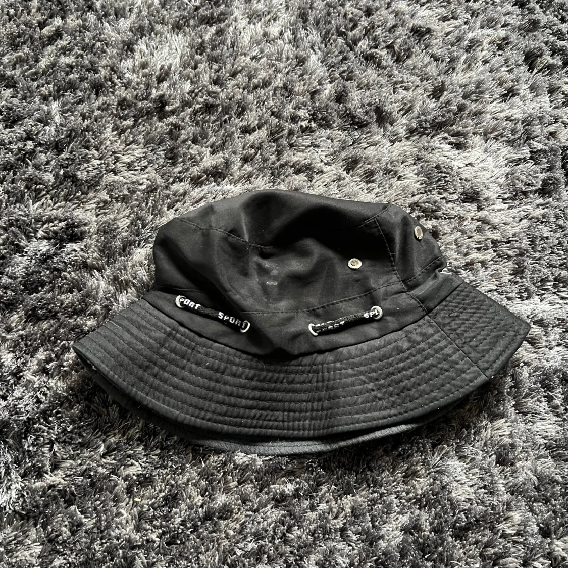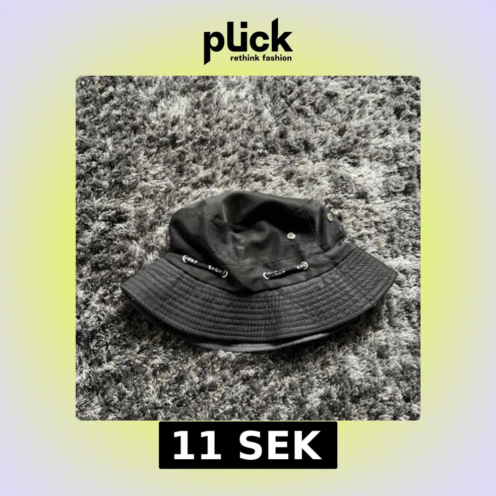 Snygg svart bucket hat med justerbar dragsko och små ventilationshål. Perfekt för en avslappnad stil.