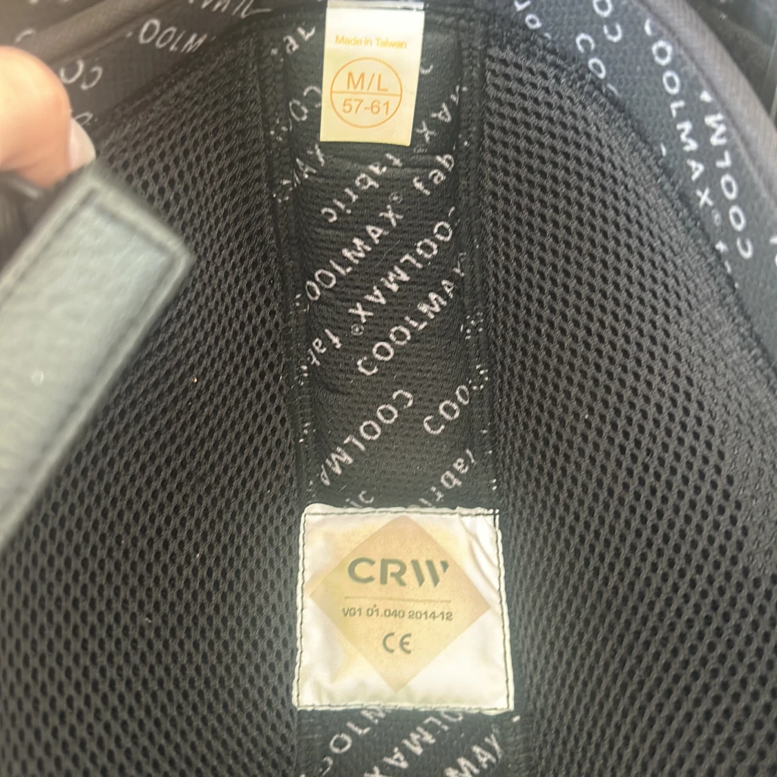 Säljer en svart ridhjälm från CRW med snygga ventiler på sidorna och fram, samt vit detalj längs skärmen. Lite små vita repor som ni ser på bilden men annars e den helt oskadad.