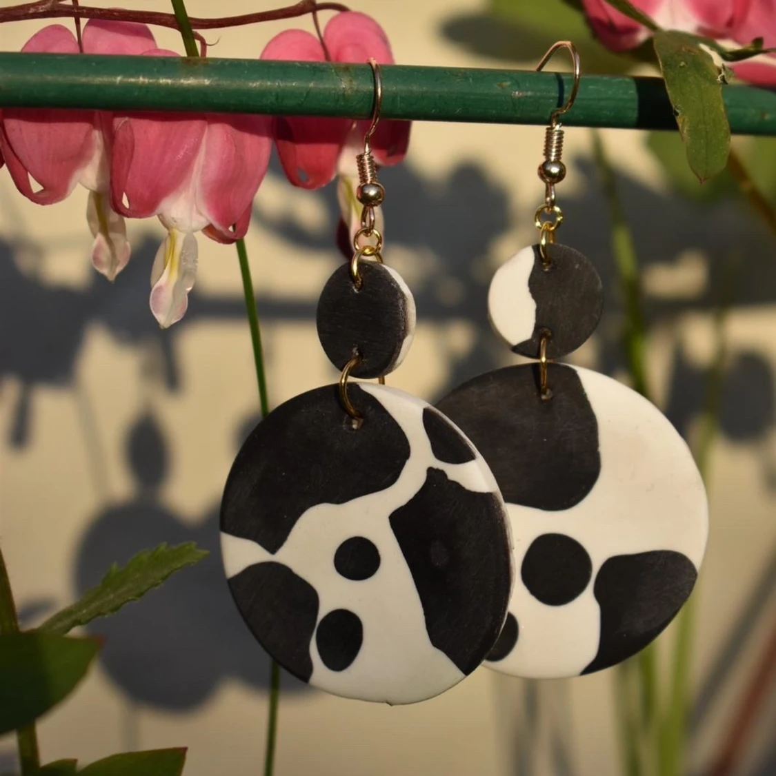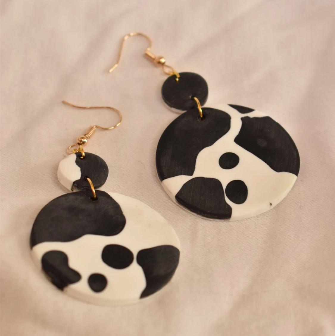 Vit bakgrund med svart ko mönster. Handgjorda örhängen utav polymer lera med guldhänge, ca 3-4cm i diamanter. 89kr kr + 20kr frakt