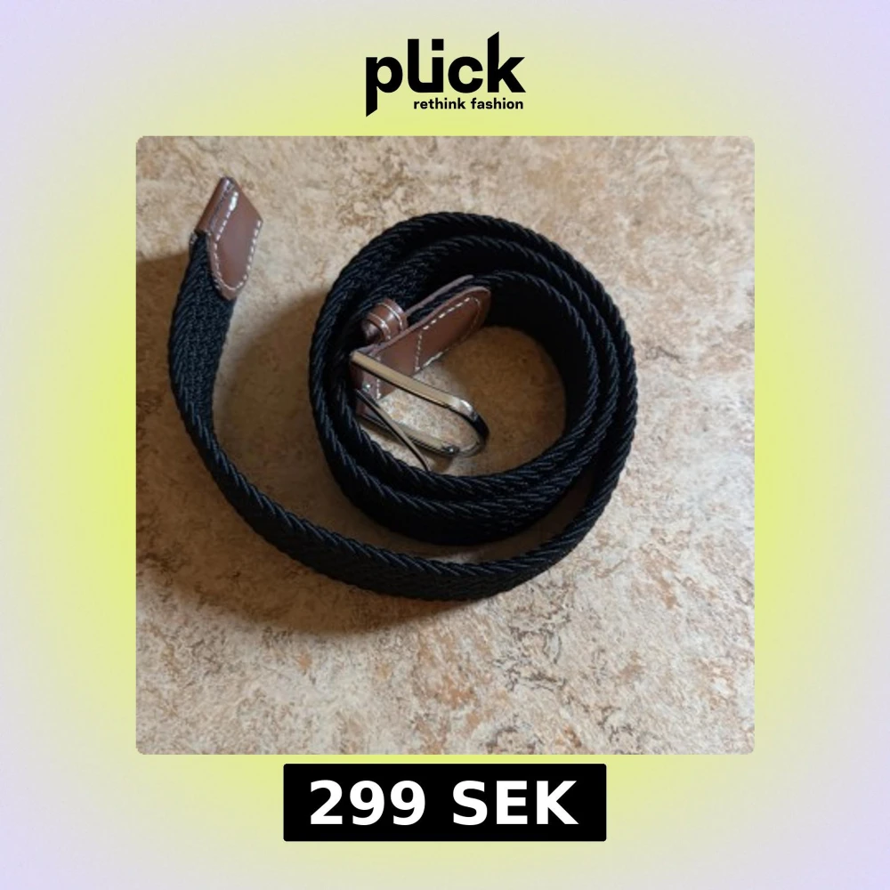 Snyggt svart flätat bälte med bruna läderdetaljer och silverfärgat spänne. Perfekt för att ge en stilren touch till din outfit. Bältet har en klassisk design med kontrasterande sömmar på läderdetaljerna.