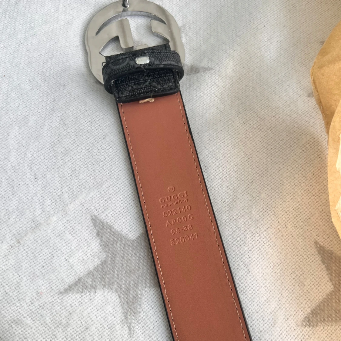 Snyggt svart bälte med klassiskt GG-mönster och ett spänne i silverfärgad metall. och bältet har en exklusiv vibe som lyfter vilken outfit som helst. Perfekt för dig som gillar designeraccessoarer.