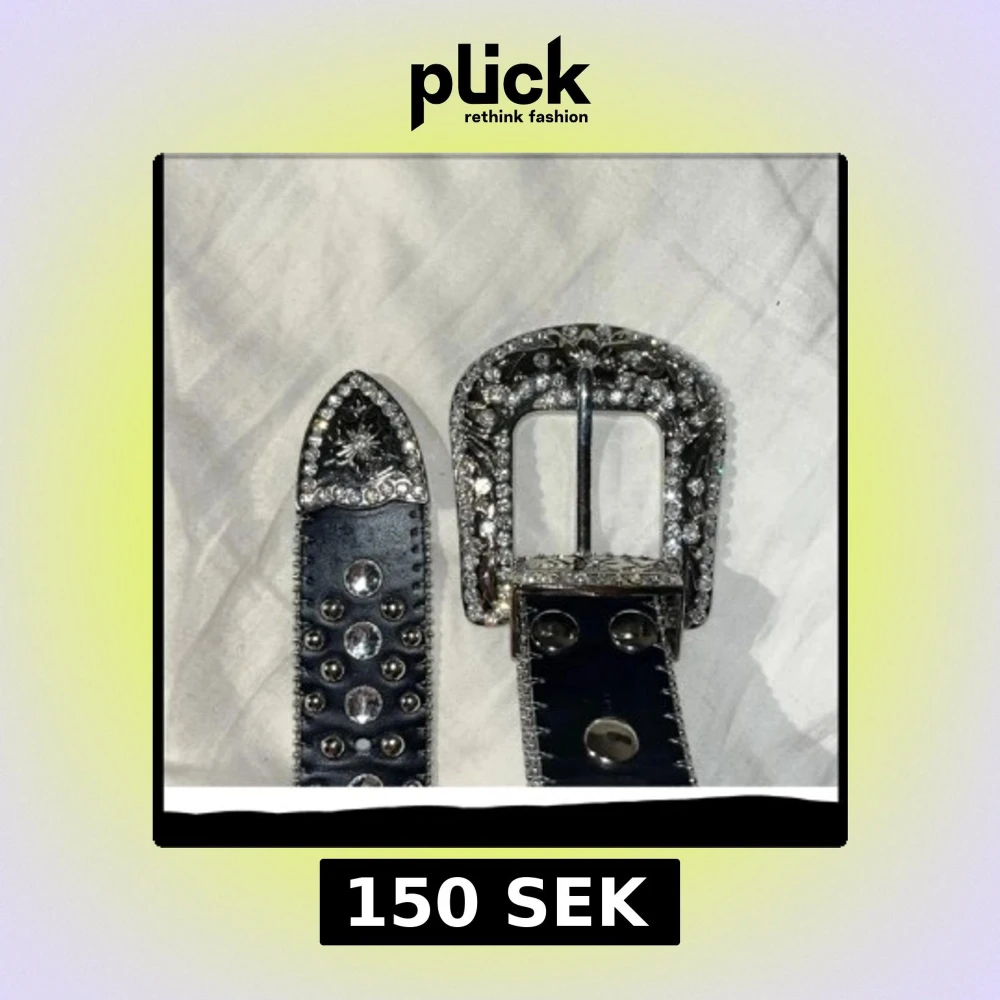 Säljer ett svart bälte med massor av glittrande strass och stora silverfärgade nitar. Spännet är dekorerat med bling och har snygga detaljer. Perfekt accessoar för att lyfta vilken outfit som helst med extra edge och glamour.
