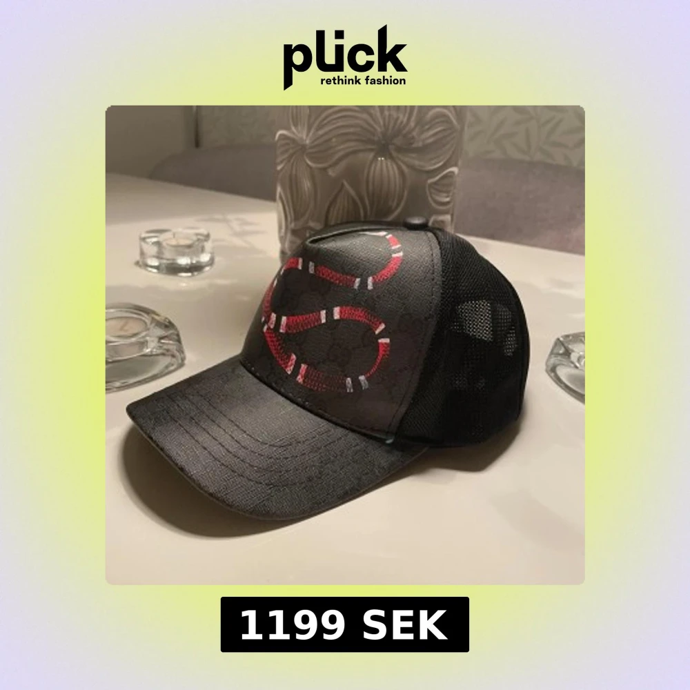 Snygg svart keps från Gucci med ett rött och vitt ormmönster på framsidan. Kepsen har justerbart band med röd och blå detalj och märkeslogga på insidan. Perfekt för en stilren look. Endast Keps.