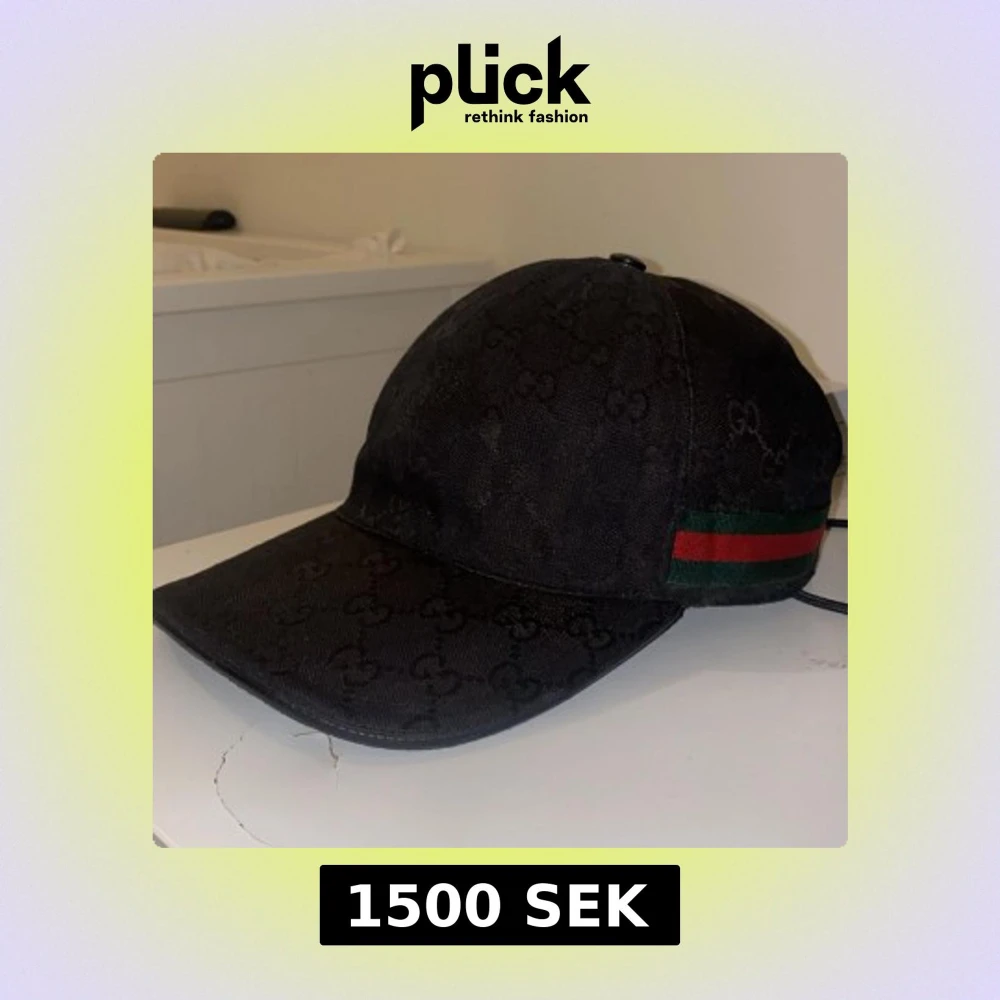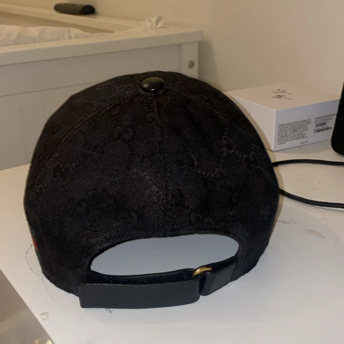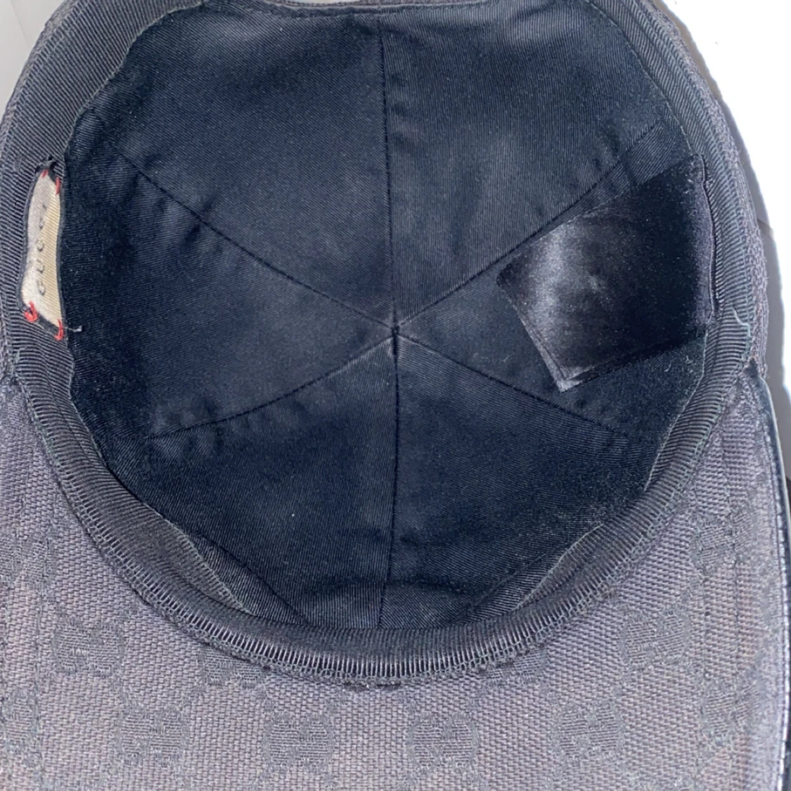 Snygg svart keps från Gucci med diskret GG-logomönster över hela ytan. Klassisk böjd skärm och justerbar rem bak i skinn. Sidan har den ikoniska gröna och röda randen. Materialet är bomull och skinn, perfekt för dig som vill ha en lyxig streetstil.