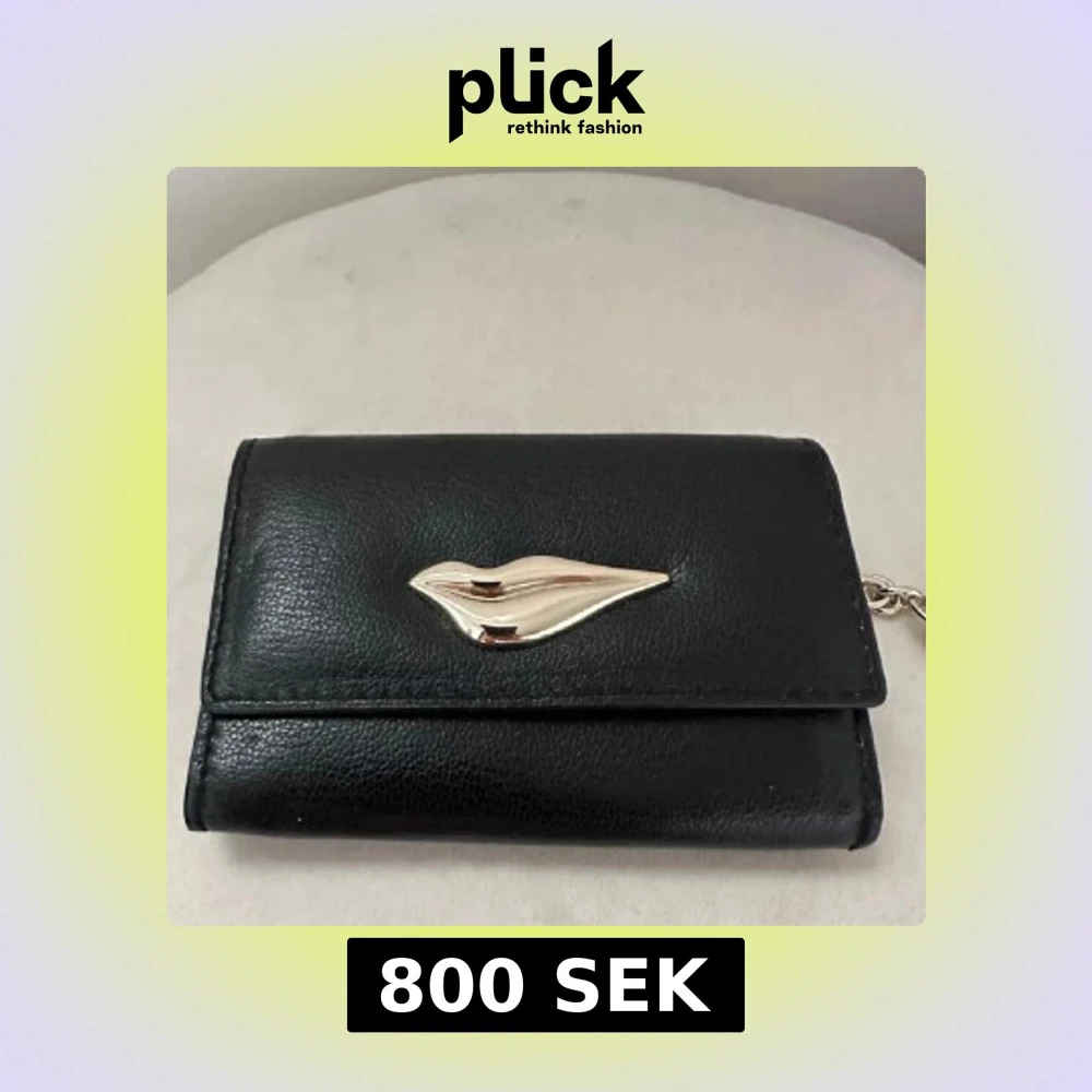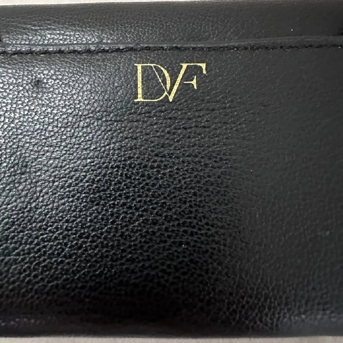 Svart plånbok i från DVF med guldfärgad läppdetalj på framsidan och nyckelring i metall. Insidan har svartvitt och ett fack. Perfekt för kort, mynt och nycklar