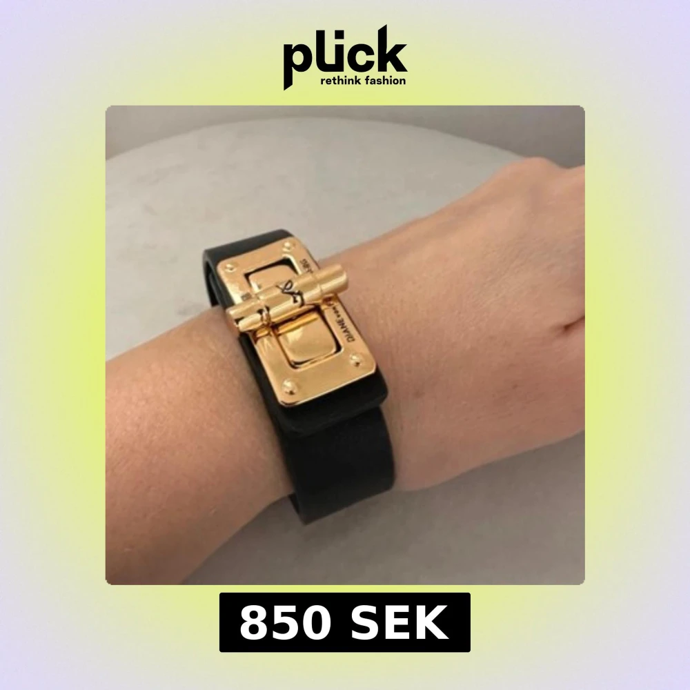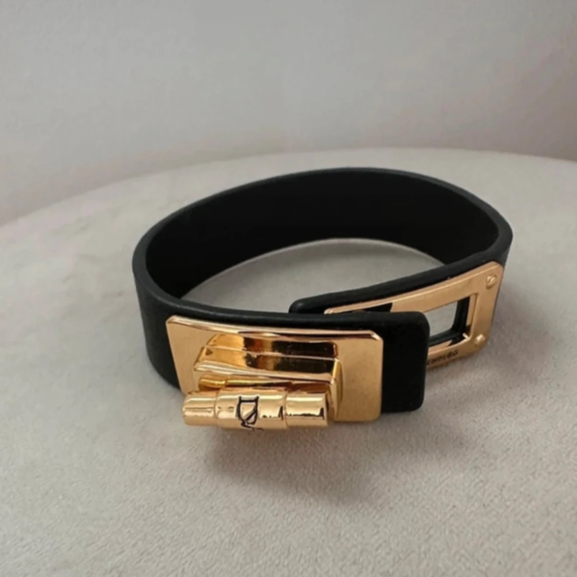 Stilrent svart armband från Diane von Furstenberg med bred rem i skinn och en chunky guldfärgad låsdetalj framtill. Låset har märkets logga ingraverad och ger en lyxig känsla