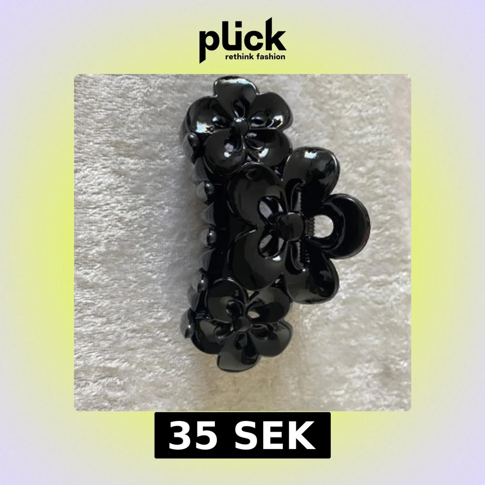 En svart hårklämma i glansig plast med stora blommor som dekoration. Klämman har en cool och stilren look med blommor på ovansidan och stark fjäder för bra grepp. Perfekt accessoar för att lyfta din frisyr. 35kr/st . Ny . Finns fler kvar