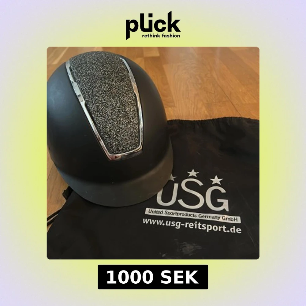 Snygg svart hjälm från USG med glittrig detalj på ovansidan och silverfärgad kant. Perfekt för ridning och ger en stilren look. Kommer med en praktisk förvaringspåse. Använd fåtal gånger!!