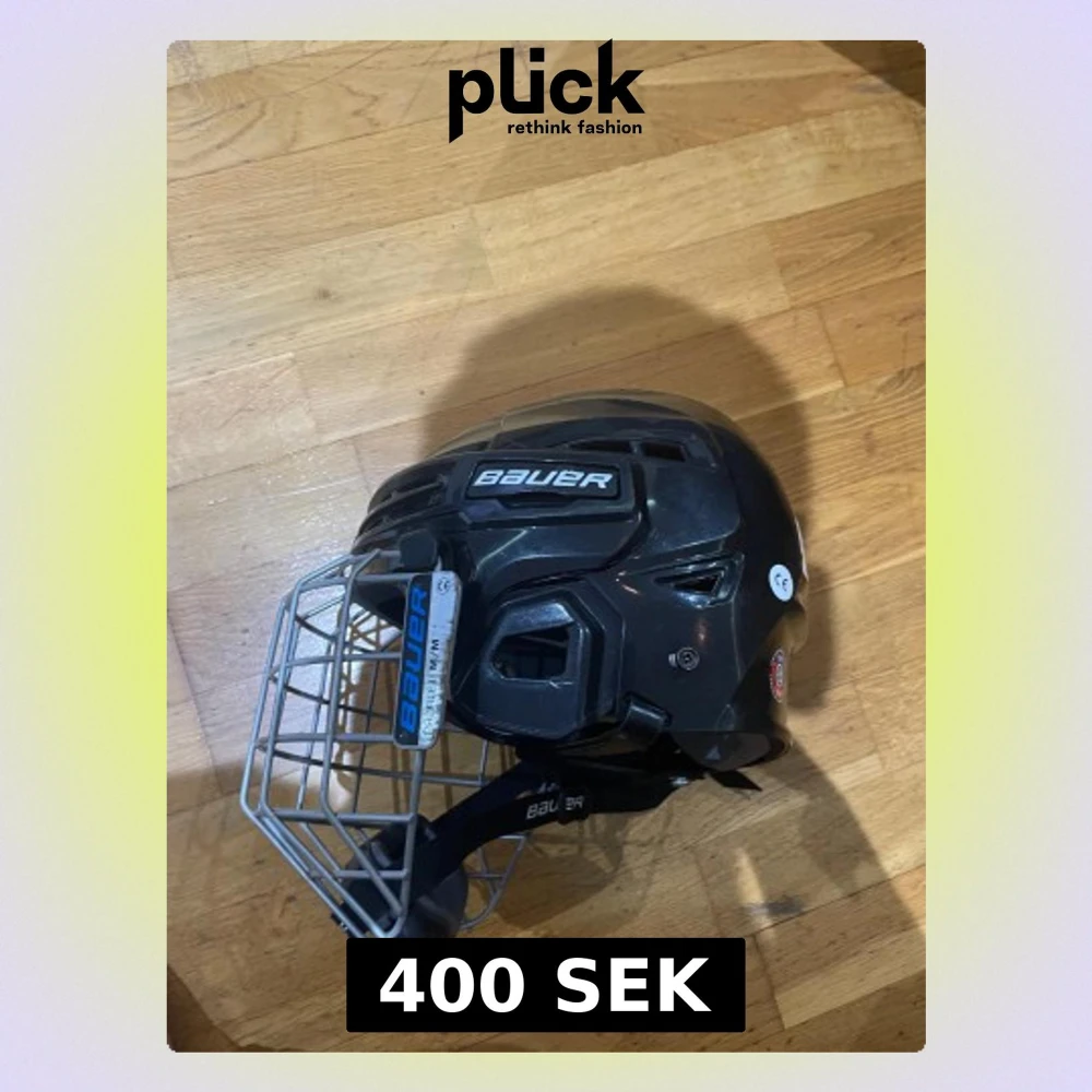 Säljer en svart hockeyhjälm från Bauer med silverfärgat galler och justerbar hakrem. Hjälmen har ventiler upptill och tydliga Bauer-loggor på både hjälm och galler. Perfekt för dig som spelar ishockey och vill ha bra skydd och stil.