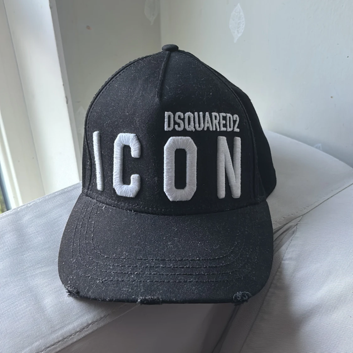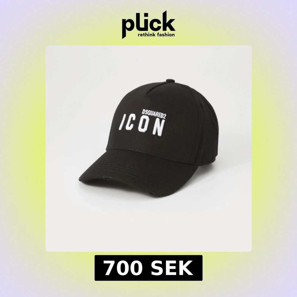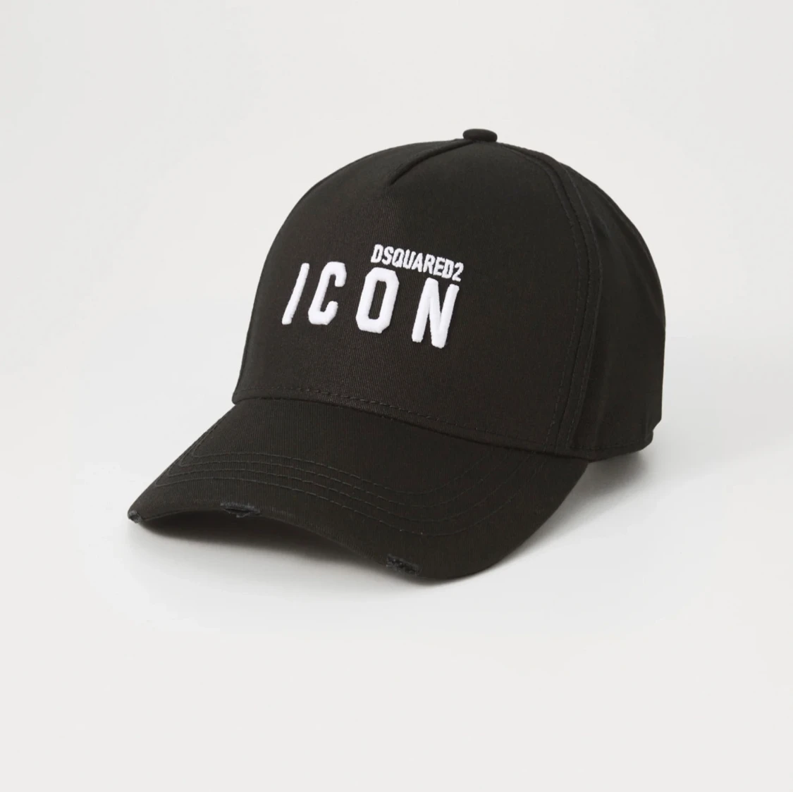 Svart keps från DSQUARED2 med stor vit broderad text 'ICON' framtill och mindre DSQUARED2-logga ovanför. Klassisk böjd skärm och justerbar passform. Tillverkad i bomull och har en stilren, urban look som sticker ut. Hjälper min bror sälja denna kepsen, originalpris: 1445kr. Kepsen är lite dammig men väldigt enkelt att bara putsa bort, annars är kepsen i jättebra skick. Pris kan diskuteras vid snabbt köp