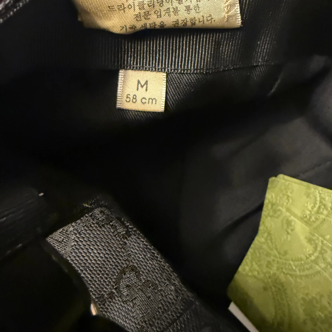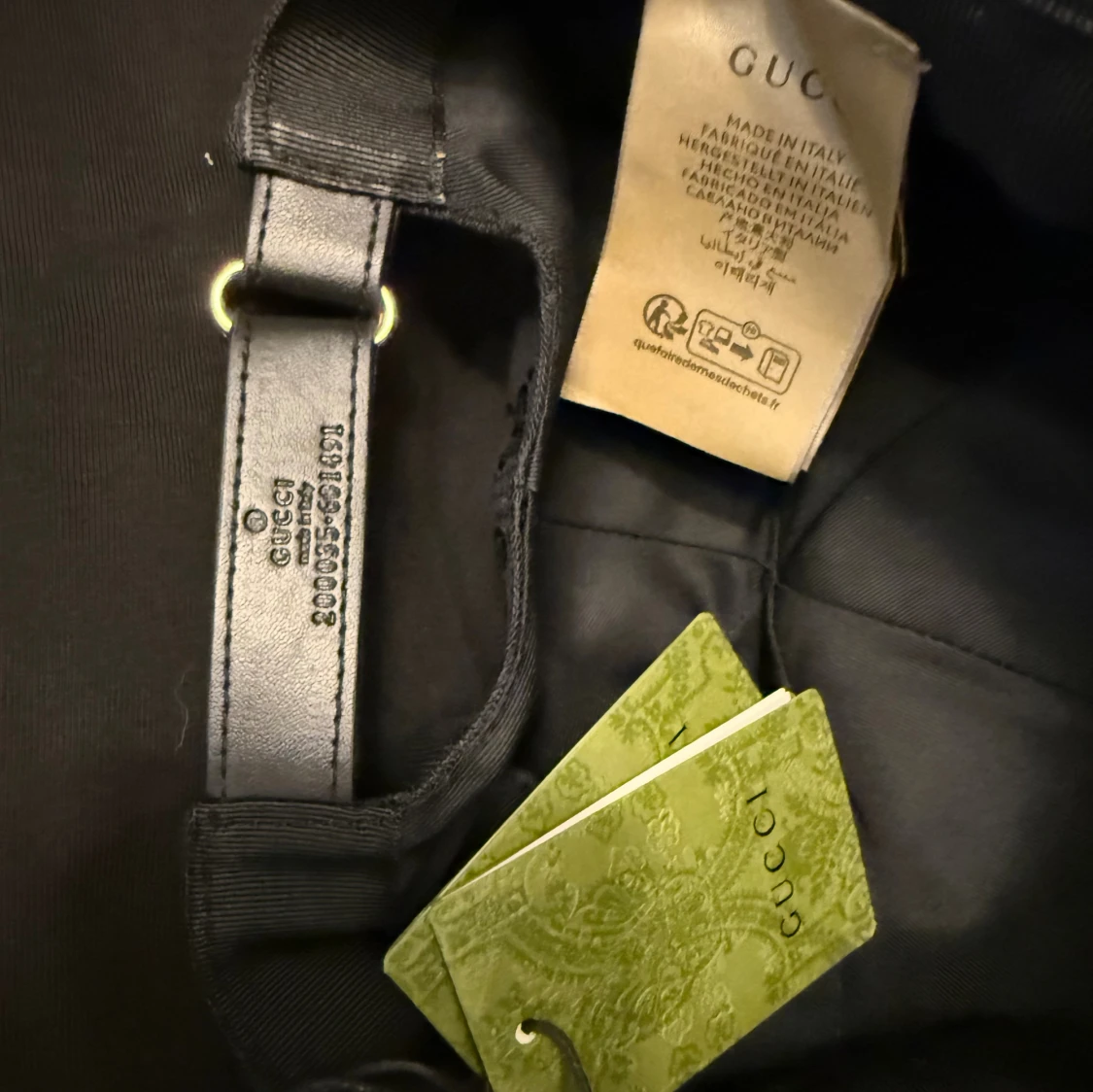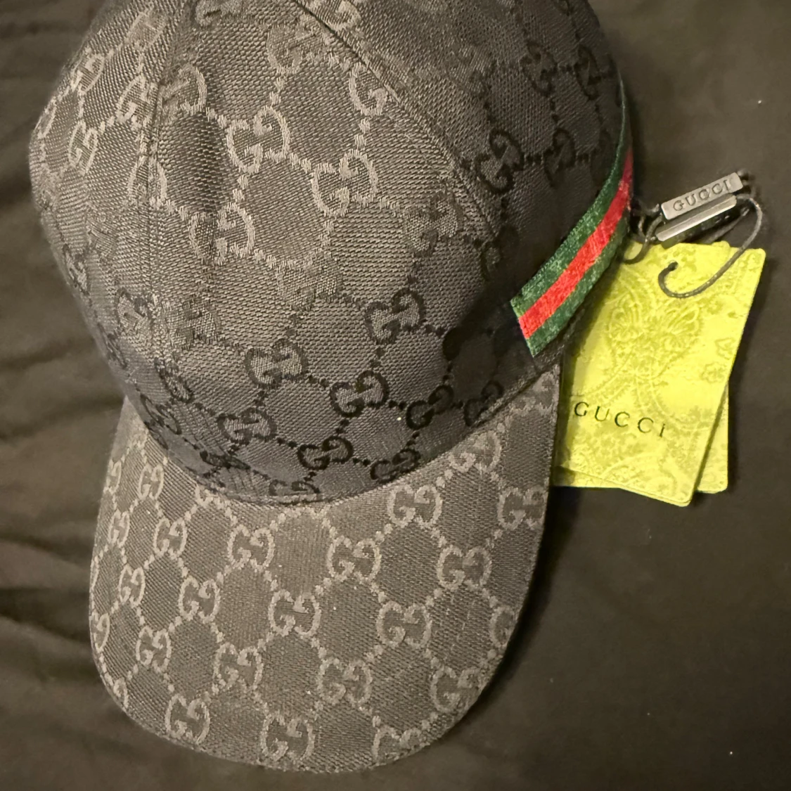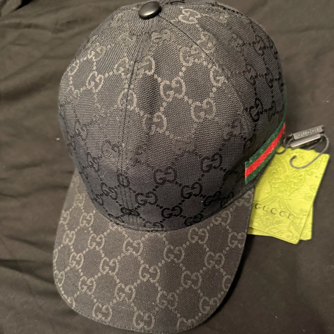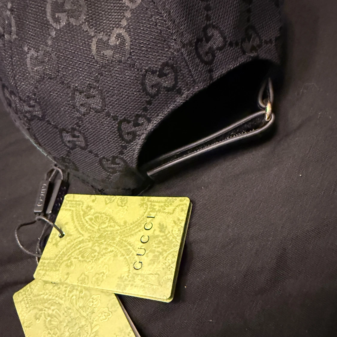 Snygg svart keps från Gucci med klassiskt GG-monogram över hela kepsen. Kepsen har justerbar rem baktill i skinn och en ikonisk grön-röd rand på sidan. Tillverkad i bomull och detaljer i skinn. Perfekt för dig som vill sticka ut med lyxig streetstyle.