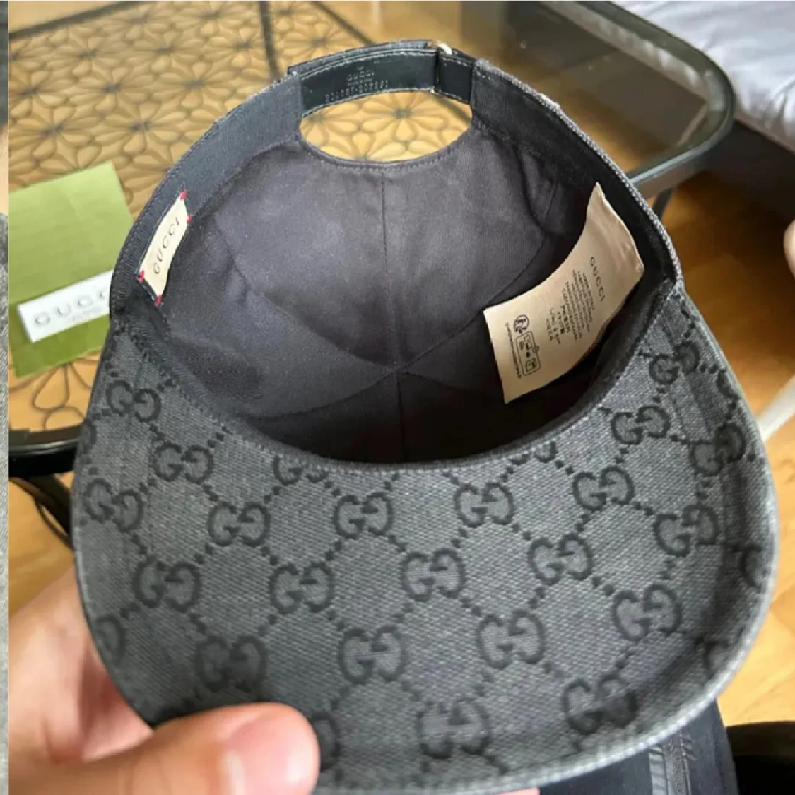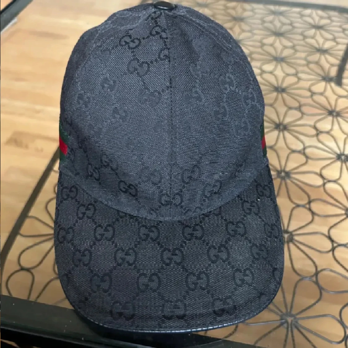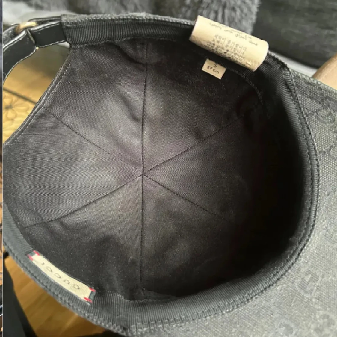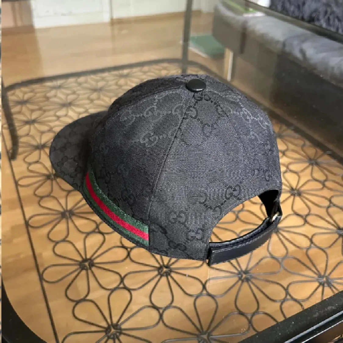 Säljer en svart keps från Gucci med klassiskt GG-monogram över hela kepsen. Kepsen har en böjd skärm, justerbart spänne bak och en ikonisk grön-röd rand på sidan. Tillverkad i bomullscanvas med läderdetaljer. Perfekt för dig som vill ha en lyxig streetstyle-look.