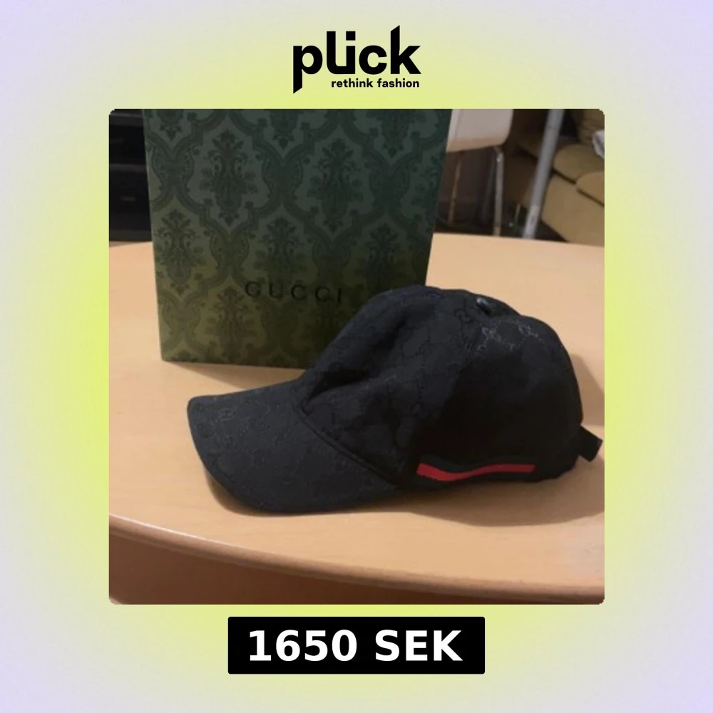 Snygg svart keps från Gucci med diskret mönster och klassiska ränder i rött och grönt på sidan. Perfekt för en stilren look.