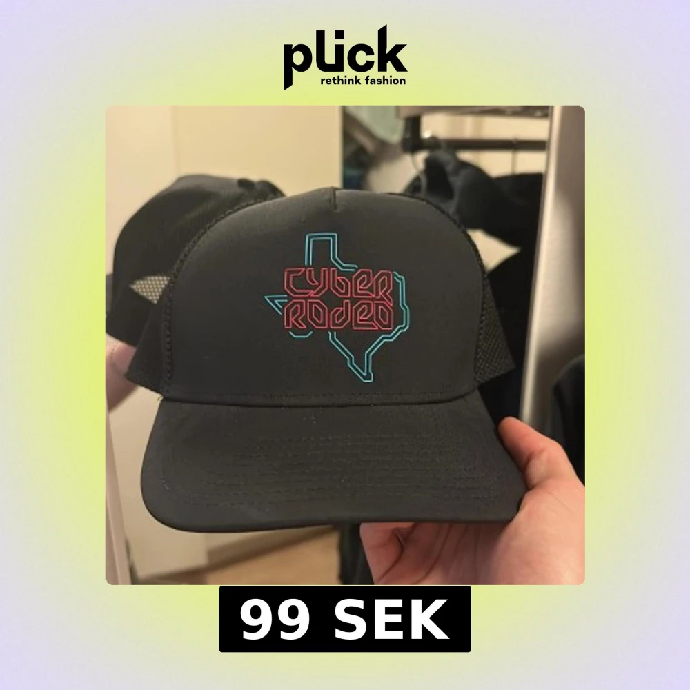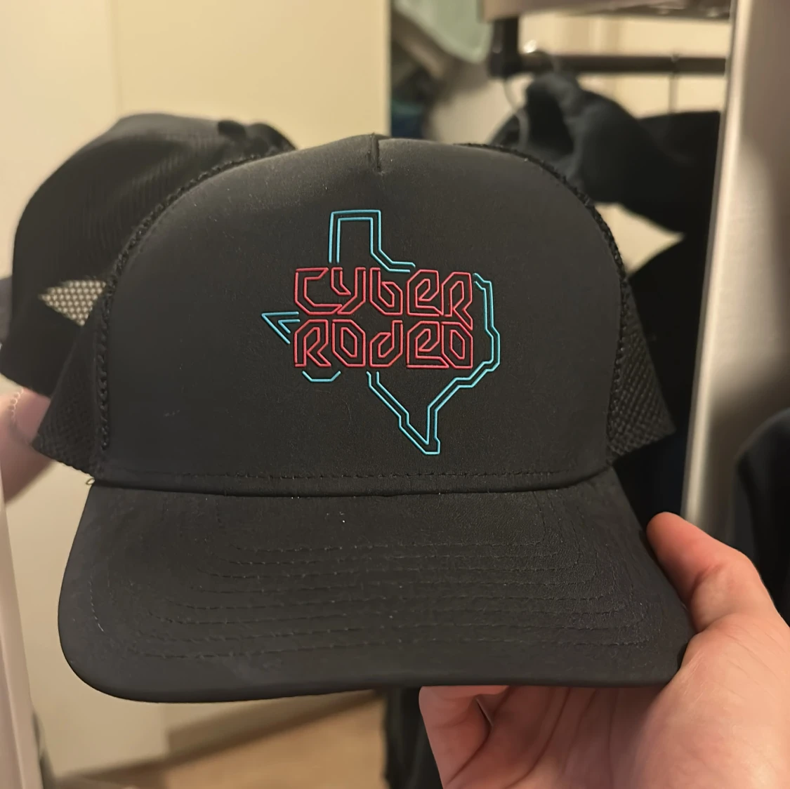 Snygg svart keps från Tesla med texten 'Cyber Rodeo' i rött och blått på framsidan. Kepsen har ett nätmaterial på baksidan för bättre ventilation och en justerbar rem för perfekt passform.