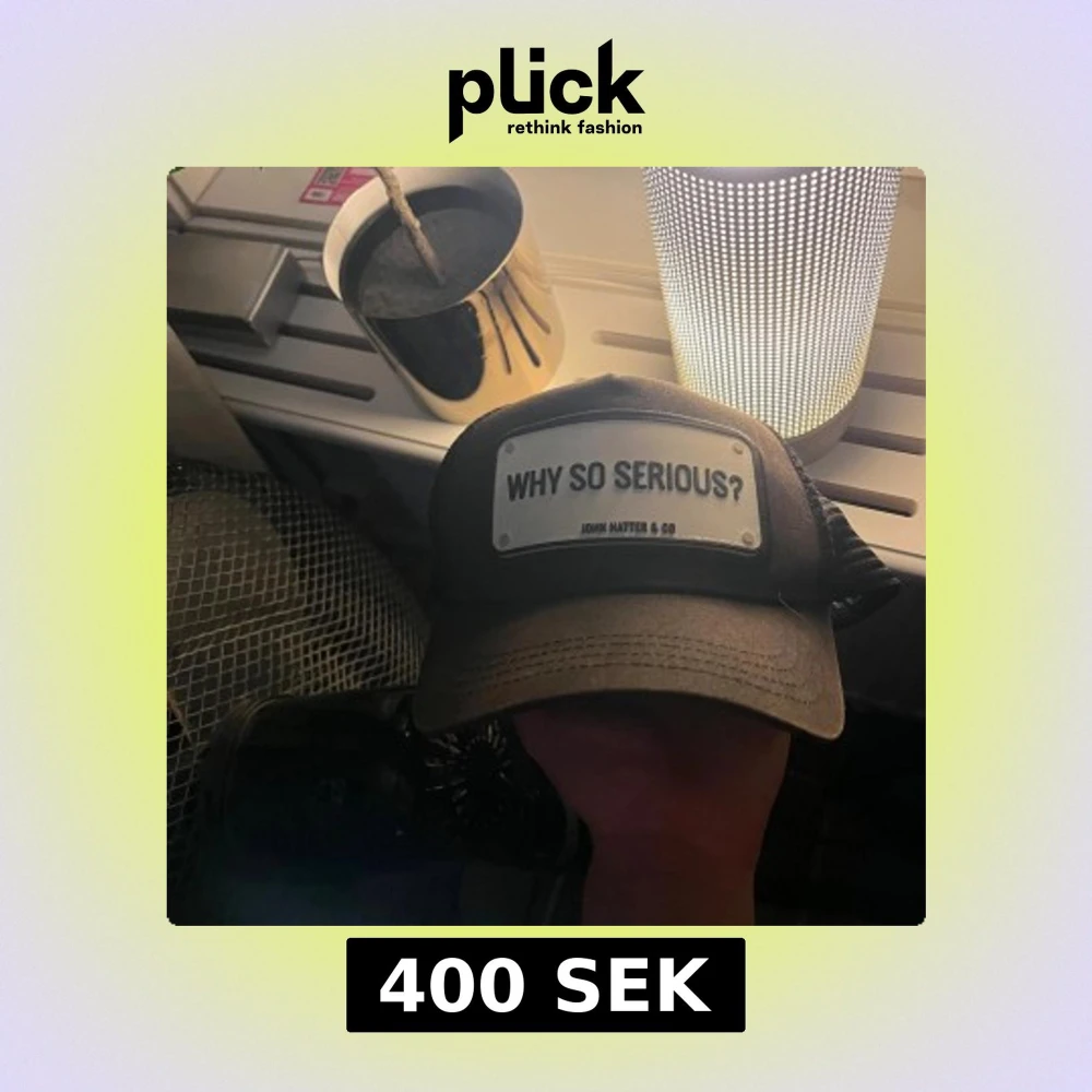 Svart keps från John Hatter & Co med texten 'WHY SO SERIOUS?' på en gummiskylt framtill. Klassisk trucker-modell med böjd skärm och mesh på sidorna och bak, samt justerbar snapback. Perfekt statement-piece för dig som vill sticka ut.