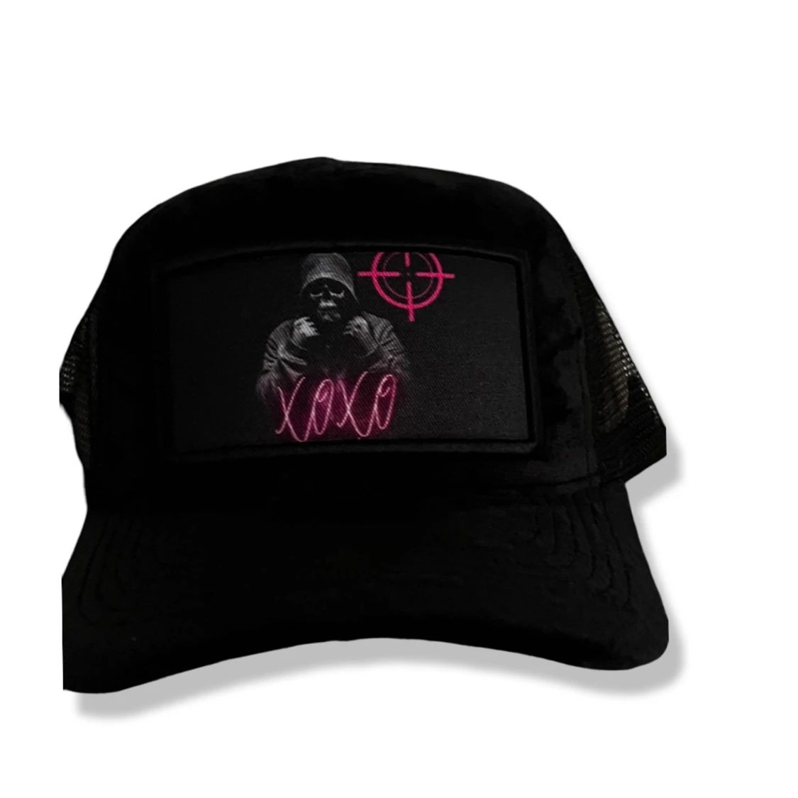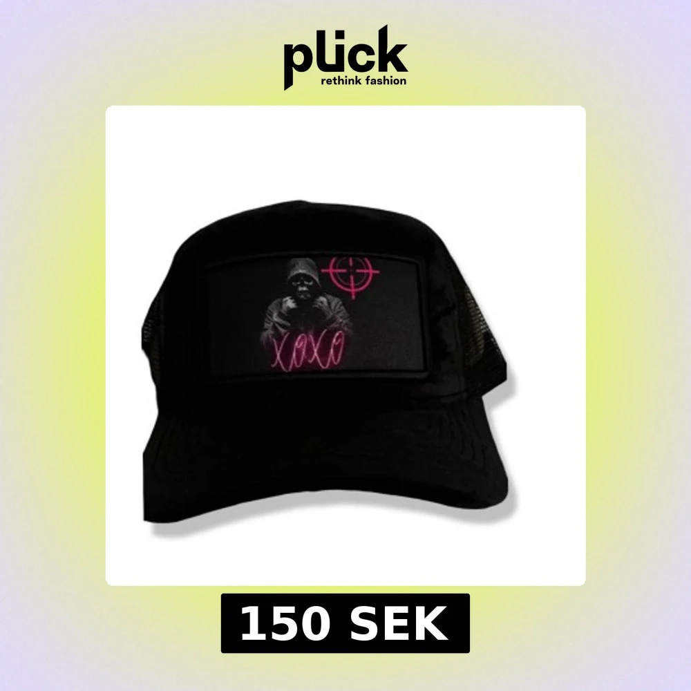 Snygg svart keps med en unik broderad design framtill. Kepsen har ett motiv av en person med texten 'XOXO' i rosa och en måltavla i samma färg. Perfekt för en cool och avslappnad stil.