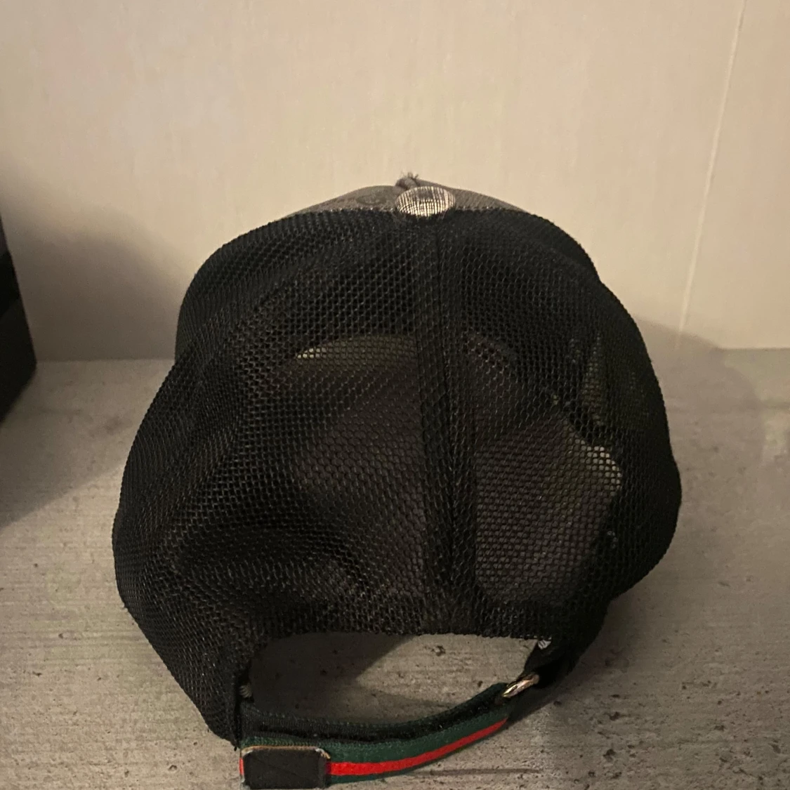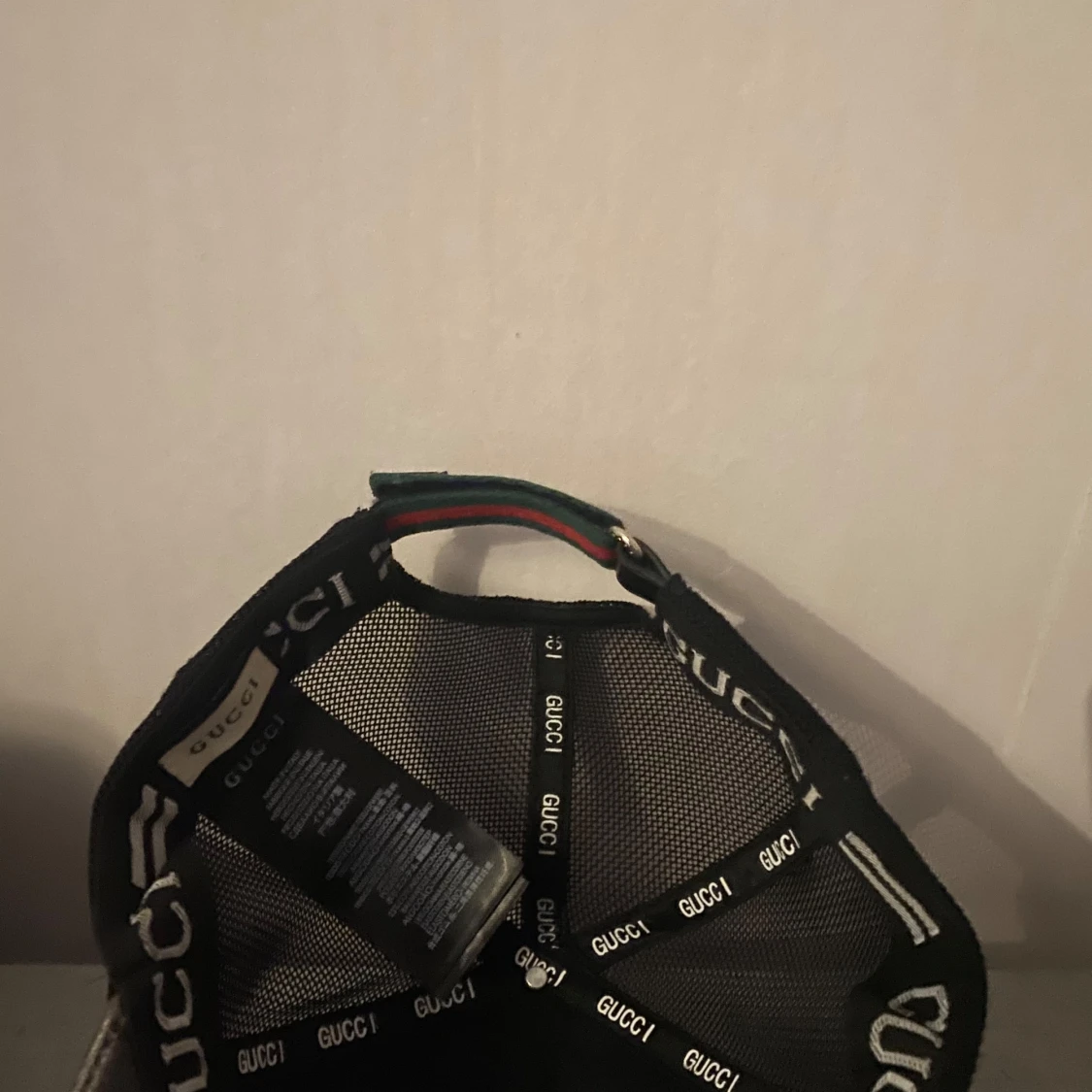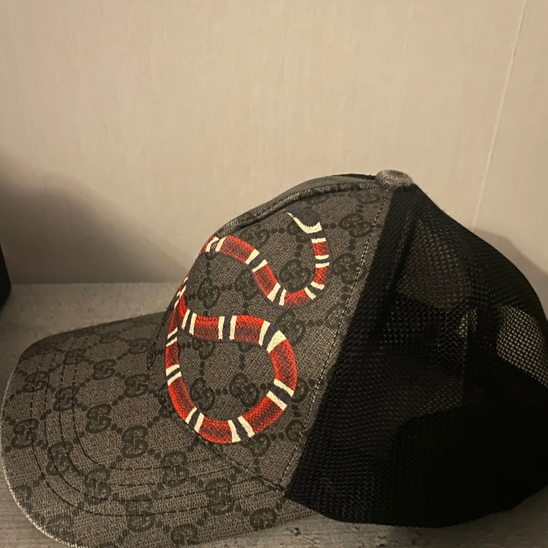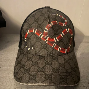 Snygg svart keps från Gucci med ett coolt ormmotiv i rött och vitt. Kepsen har ett klassiskt mönster och justerbar rem baktill. Perfekt för att ge din outfit en lyxig touch. Pris kan diskuteras!