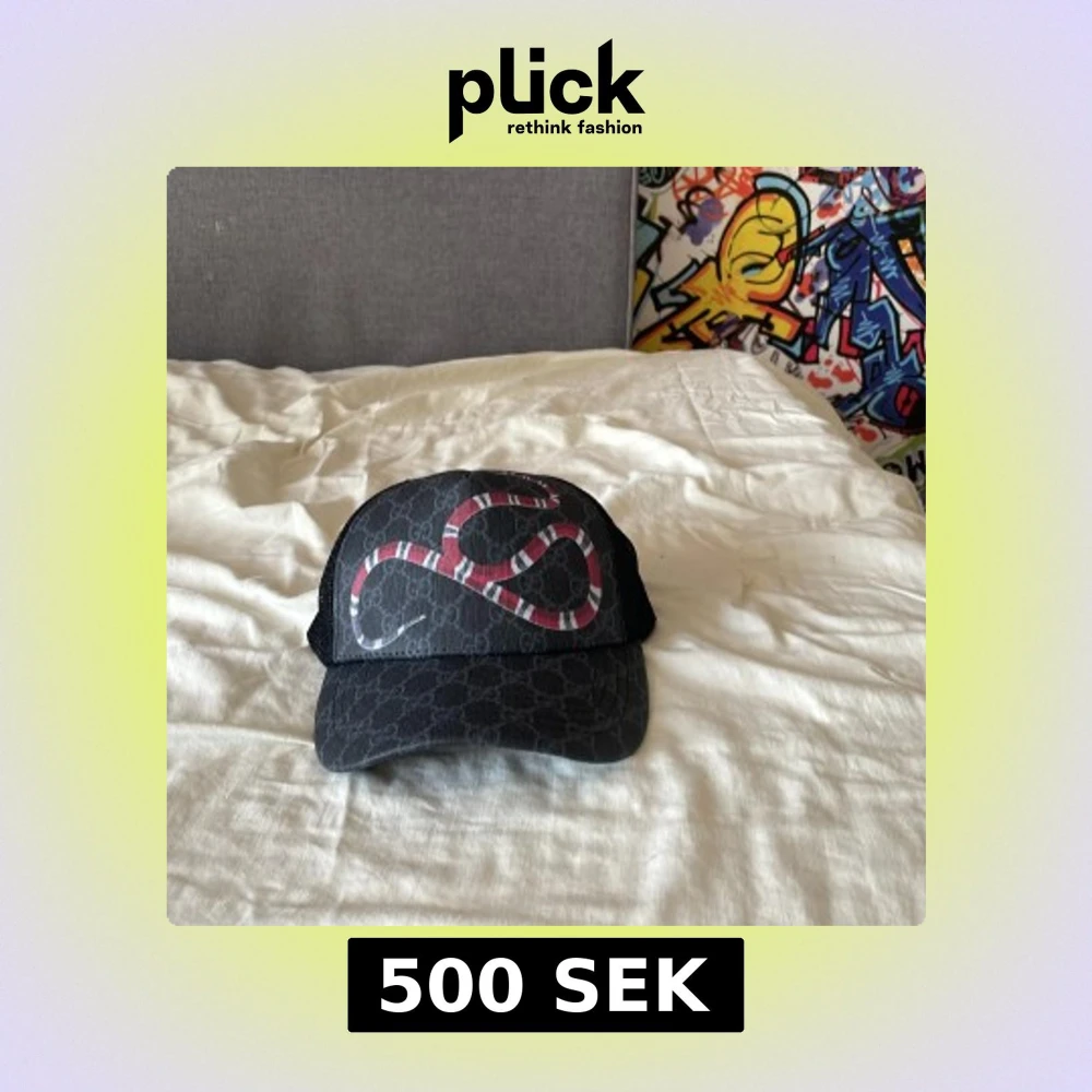 Snygg svart keps med ett coolt ormmönster i rött och vitt. Kepsen har ett nätmaterial på sidorna och ett justerbart spänne bak för perfekt passform. Perfekt för att ge din outfit en edgy touch. Varan ör köpt på denna app plick så är inte säker att den är äkta