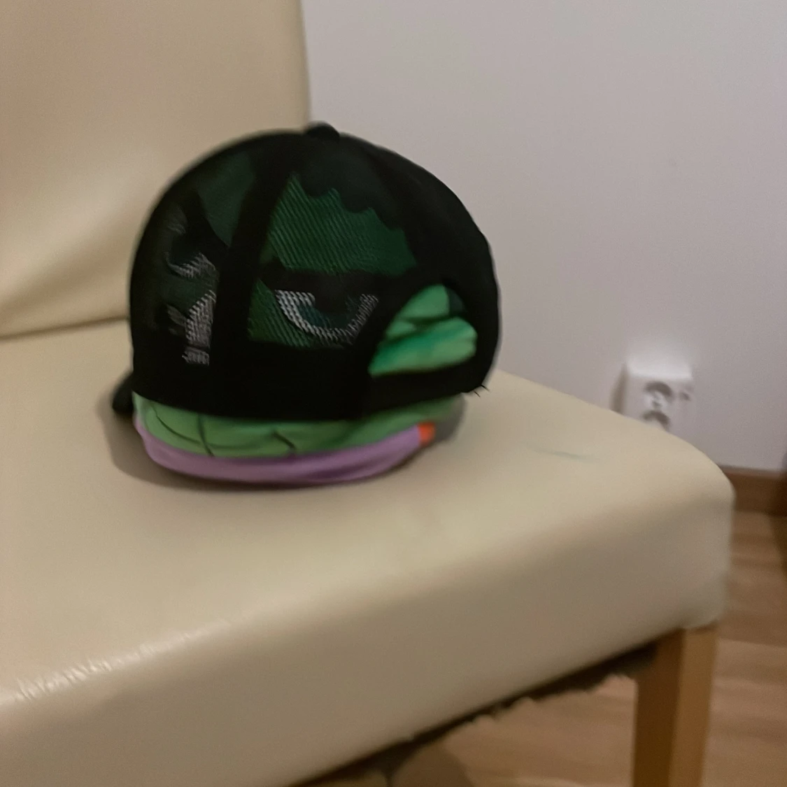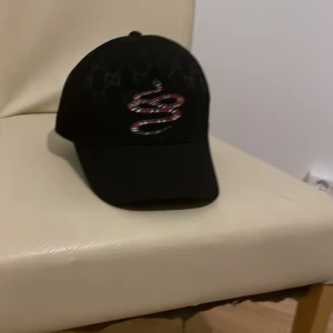 Snygg svart keps med ett coolt ormtryck i rött och vitt framtill. Kepsen har ett nätmönster baktill för bättre ventilation. Perfekt för en avslappnad stil.