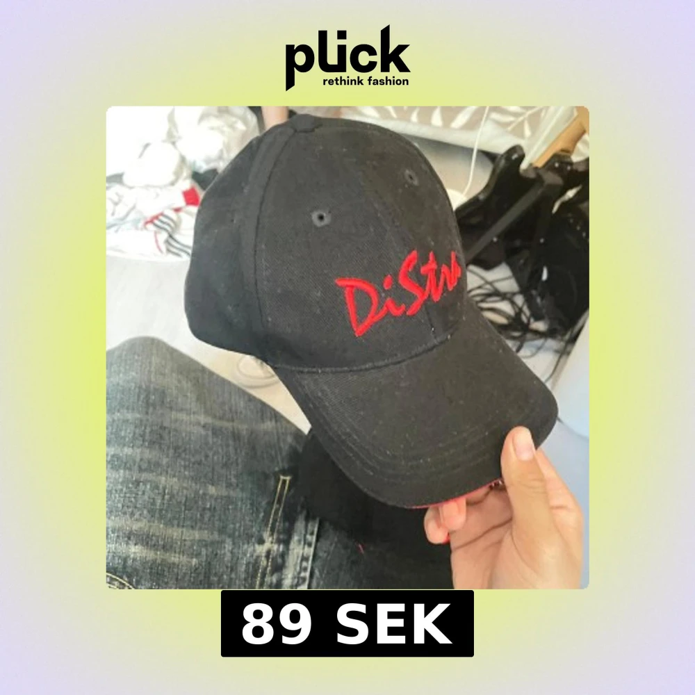 Svart keps med böjd skärm och röd brodyr framtill med texten 'DiStra' samt webbadress bak. Justerbar rem baktill och röd detalj längs skärmens kant. Snygg och enkel design, perfekt för dig som gillar streetwear. 89 för båda.