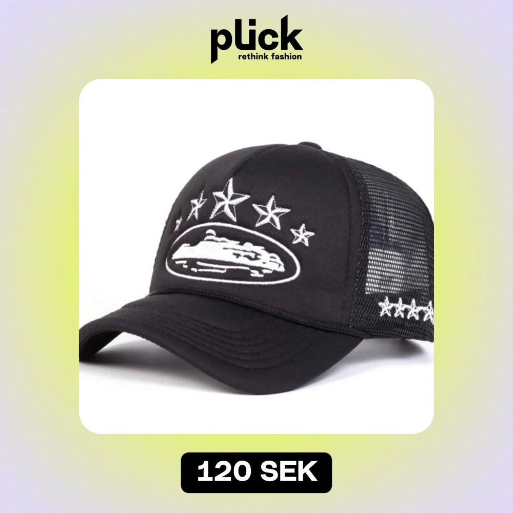 Snygg svart keps med vit broderad design av stjärnor och ett coolt motiv på framsidan. Kepsen har ett nät på baksidan för bra ventilation och en böjd skärm för en klassisk look. Perfekt för både vardag och fest!