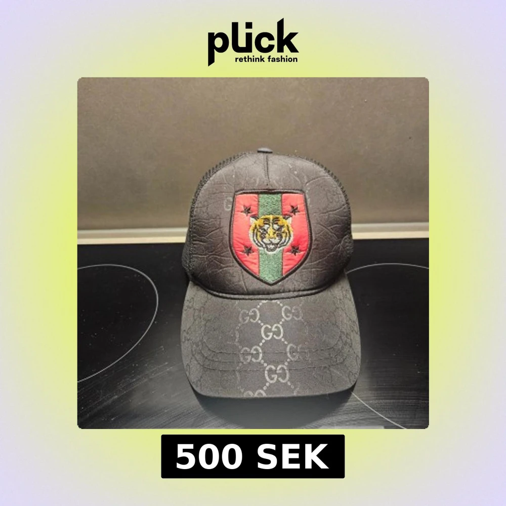 Säljer en svart keps med klassiskt GG-mönster och en stor broderad patch framtill med tiger, röda och gröna ränder samt stjärnor. Kepsen har mesh baktill och justerbar snapback. Perfekt för dig som vill sticka ut med en lyxig accessoar.