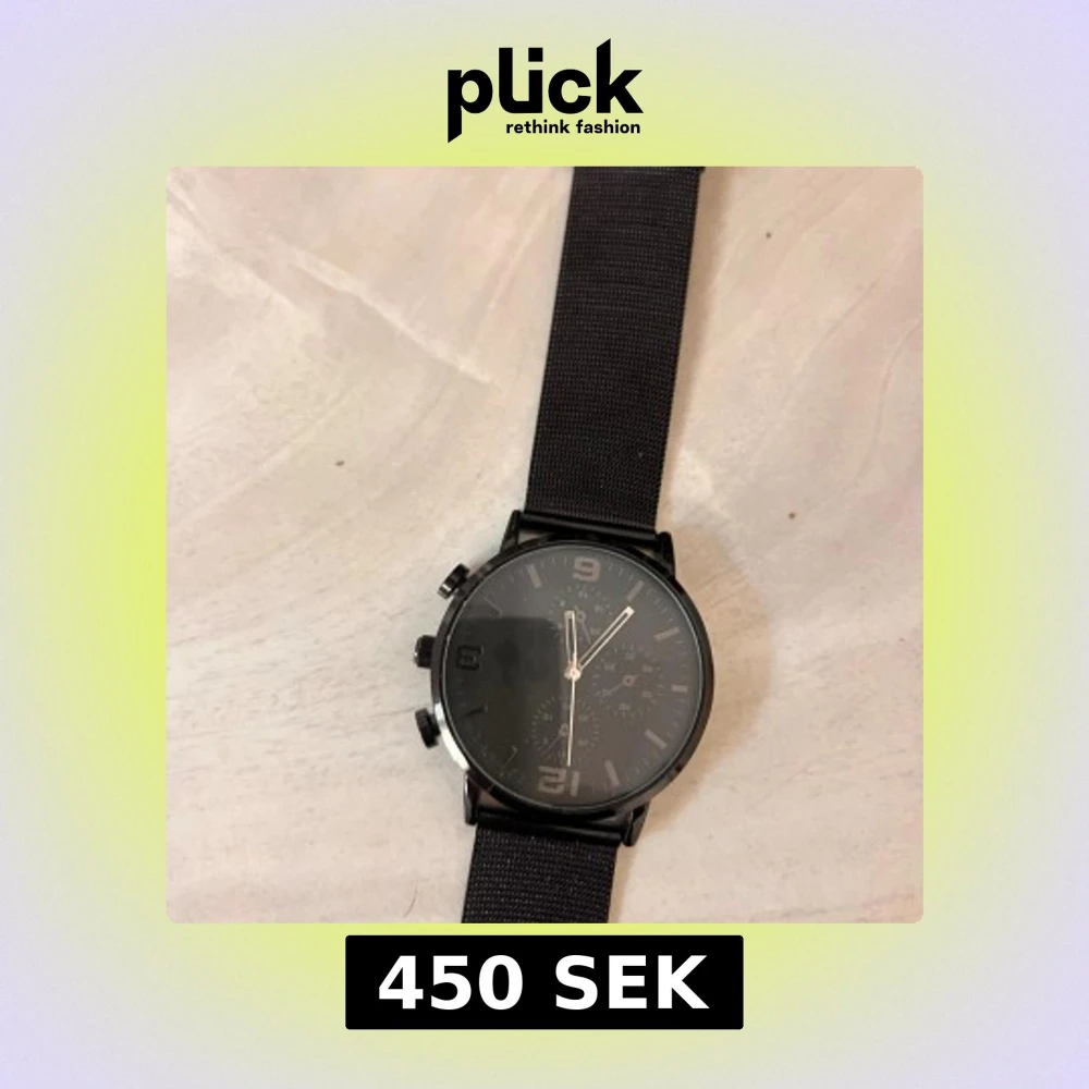 Stilren svart klocka från FIER ONE med rund urtavla och mesharmband i metall. Urtavlan har tydliga siffror och flera små visare för extra funktioner. Klockan har tre knappar på sidan och ett snyggt, minimalistiskt utseende som passar till många stilar.