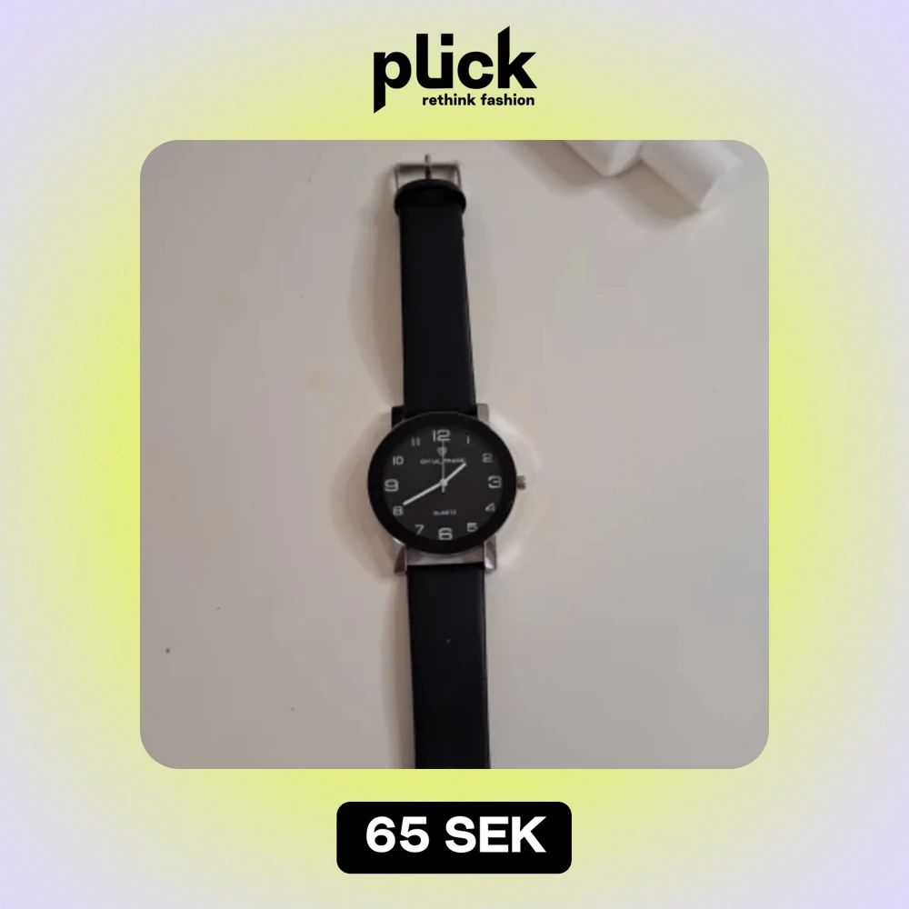 En elegant svart klocka från Skylange med en rund urtavla och tydliga vita siffror. Klockan har en svart rem och en silverfärgad spänne. Den är av quartz-typ och har en minimalistisk design.