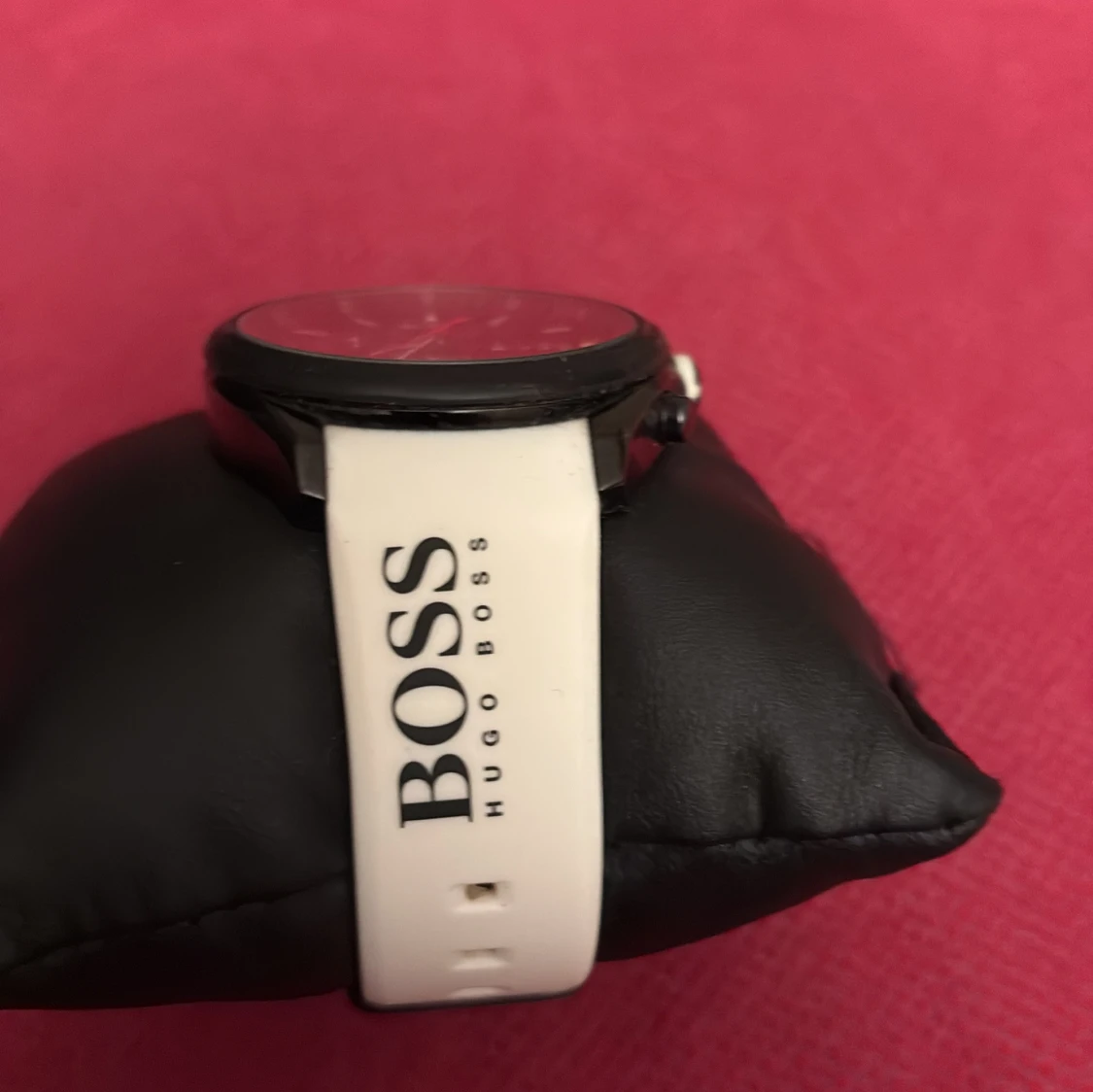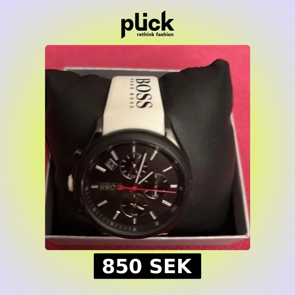 Snygg kronografklocka från Hugo Boss med svart urtavla, vita index och detaljer i rött. Klockan har en vit rem med BOSS-logga och flera små urtavlor för extra funktioner. Rund boett i svart metall och sportig design som sticker ut.