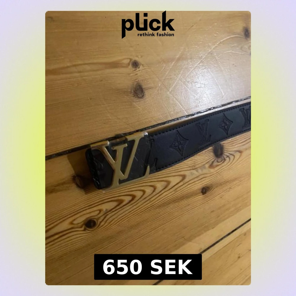 Svart läderbälte med ikoniskt mönster längs hela bandet och en stor, guldig LV-spänne framtill. Bältet är tillverkat i Spanien och har exklusiv känsla med tydliga detaljer och präglad logga på insidan.