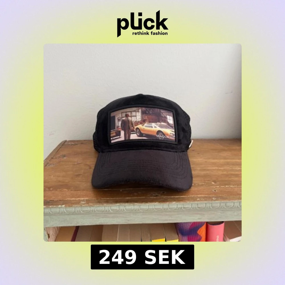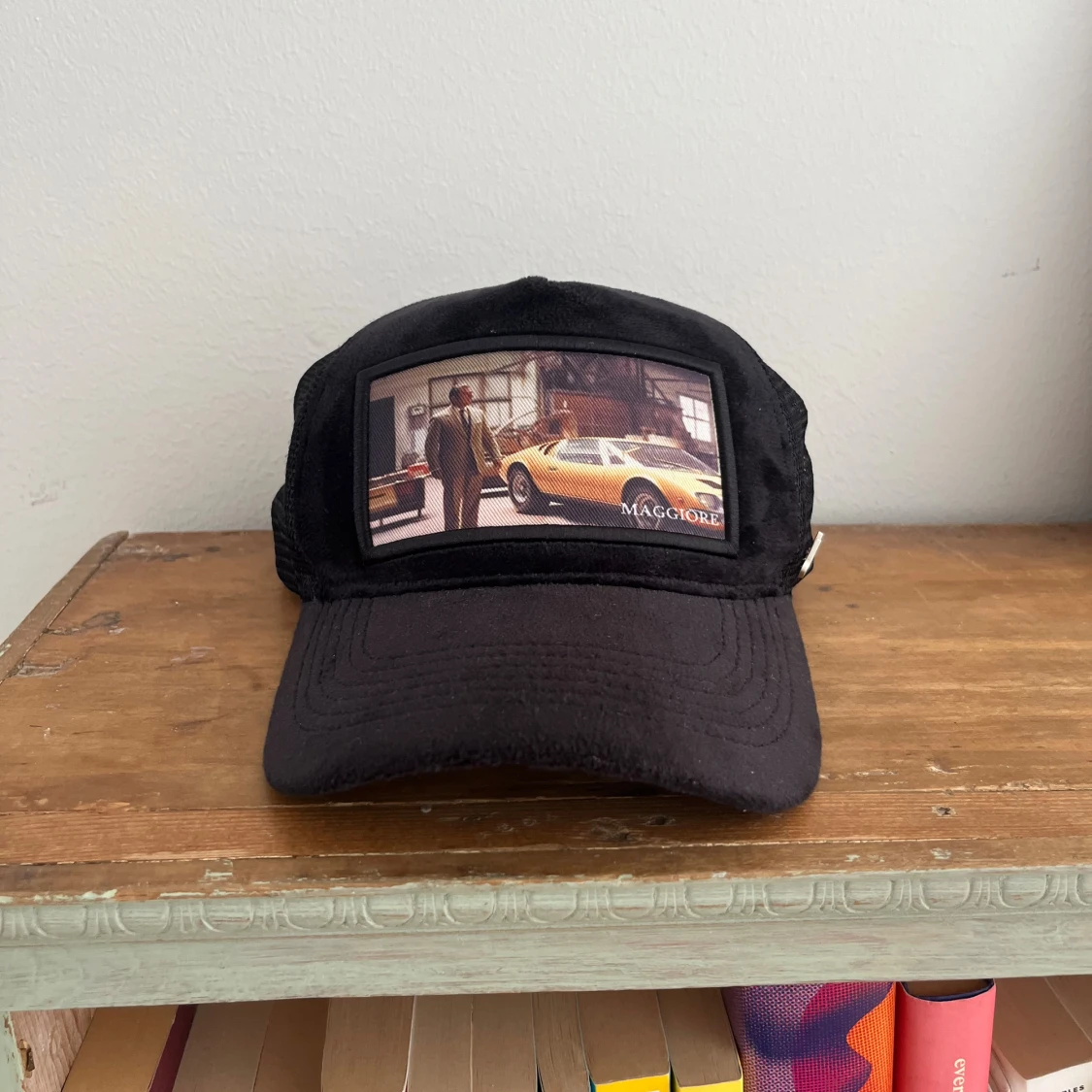 Svart keps från Maggiore med mesh på sidorna och bak, justerbart spänne i skinnimitation och coolt motiv med bil och person framtill. Märkets logga syns både invändigt och som metallmärke på sidan. Perfekt för dig som gillar bilar och streetstyle.