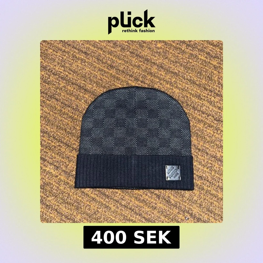 Snygg svart mössa med ett diskret rutigt mönster. Mössan har en ribbad kant och en liten etikett med logotyp. Helt ny och vi kan diskutera priset om det är för högt.