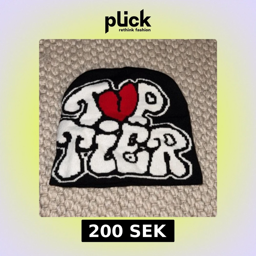 Cool svart mössa med vit text 'Top Tier' i stor, bubblig stil och ett rött hjärta som O. Perfekt accessoar för att sticka ut i mängden. Mjuk och stretchig, passar de flesta huvudstorlekar.