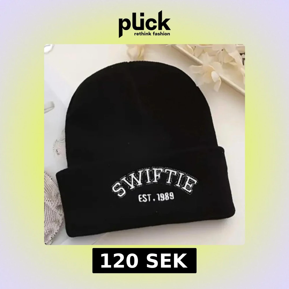 Snygg svart mössa med texten 'SWIFTIE EST. 1989' broderad framtill. Perfekt för fans som vill hålla sig varma och stiliga under kyliga dagar.