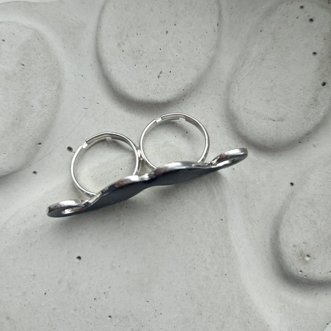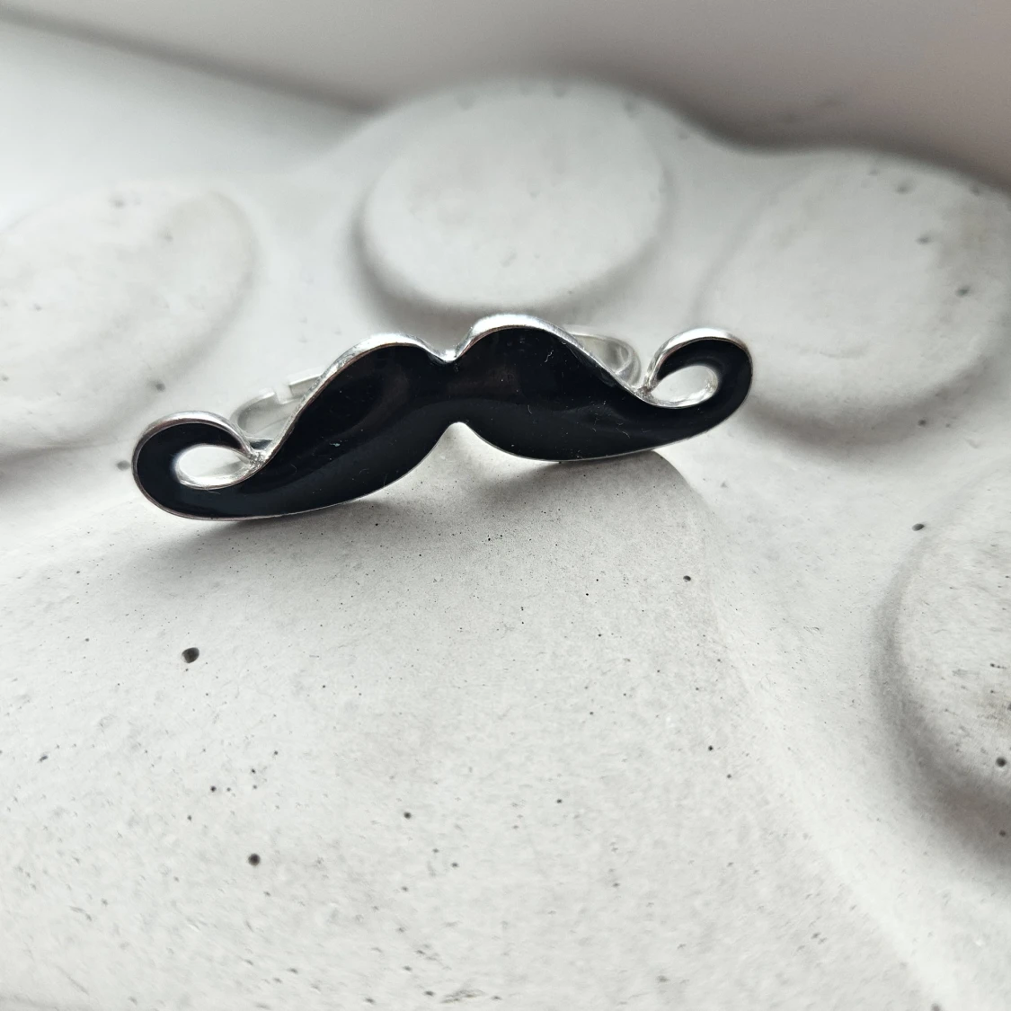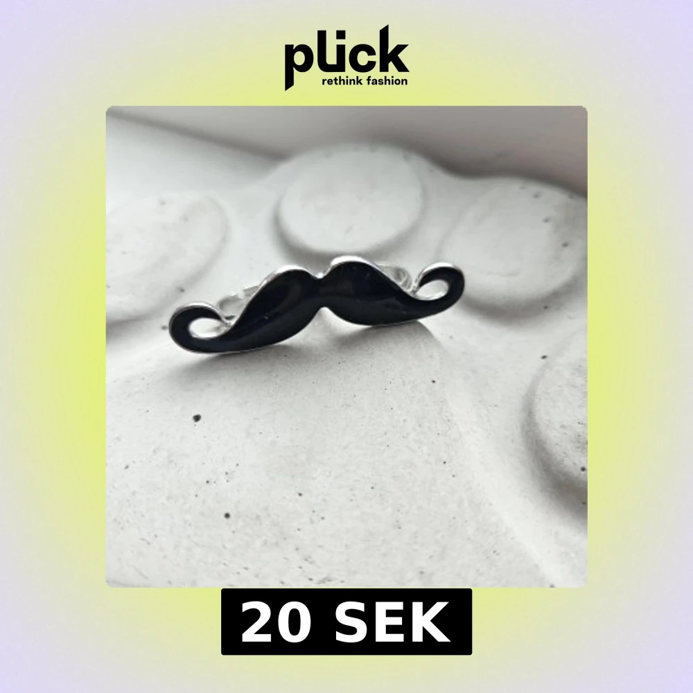 Cool dubbelring i form av en svart mustasch med silverfärgad kant. Ringen har två ringar för fingrarna och en blank finish som verkligen sticker ut. Perfekt accessoar för dig som vill ha något unikt och lekfullt. Säljer pga att den inte kommer till användning just nu