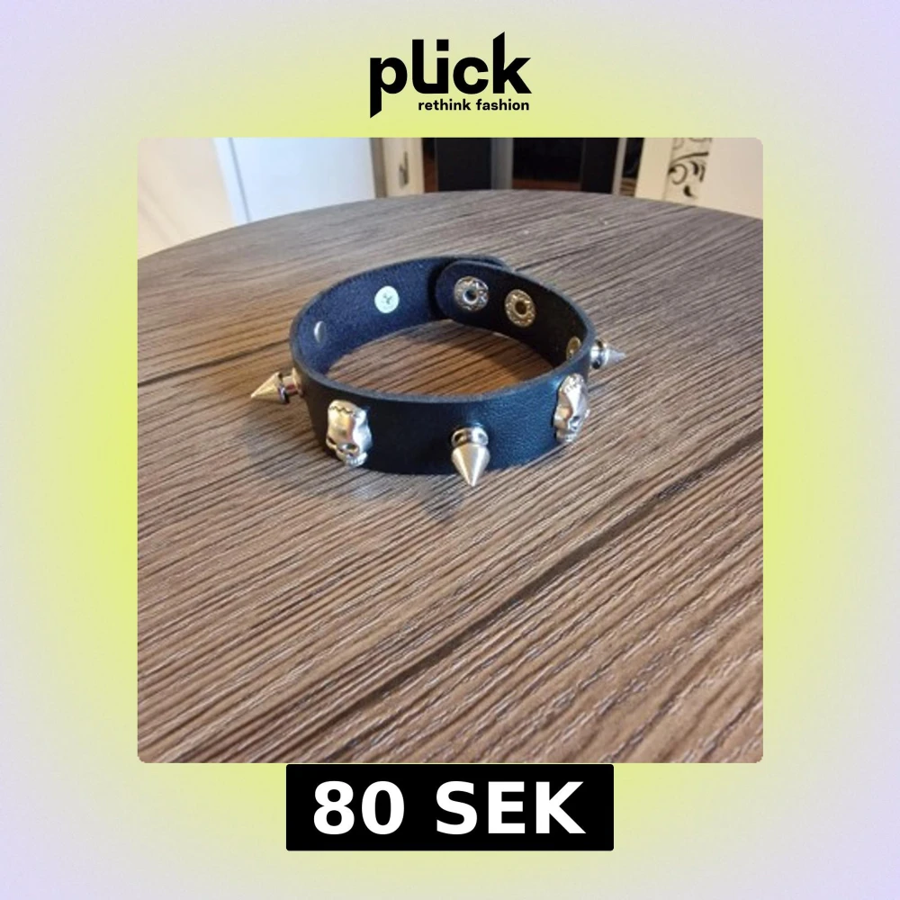 Cool svart choker i PU läder med silverfärgade nitar och döskalle-detaljer. 22 cm långt.Chokern har tryckknappar för enkel stängning och justering. Perfekt accessoar för dig som gillar edgy och alternativ stil.